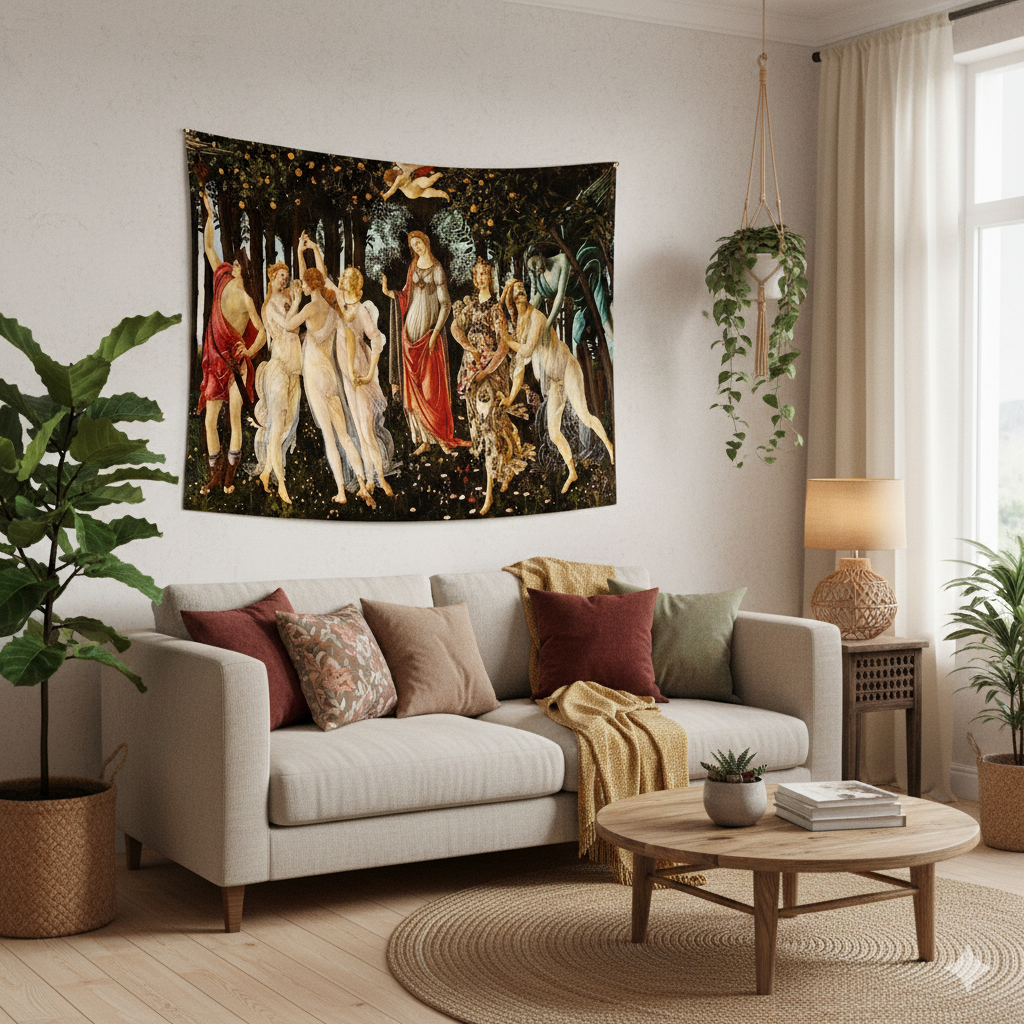La Primavera es una de las obras mas bellas del artista florentino y del renacimiento italiano. Llena de simbolismo y mitología; dioses, diosas, ninfas… Armonía y personalidad. Nos maravillamos cuando contemplamos el escenario de esta alegoría colorista y vegetal de más de doscientas especies botánicas existentes en la Toscana, sin embargo la fuerza emocional del cuadro la lleva la mujer como figura mitológica.