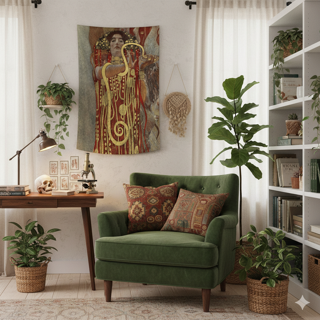 Vestida con una túnica decorada al estilo Klimt, la diosa tiene una larga serpiente enroscada en su brazo derecho que bebe de su copa. Nos mira solemne y nos da cierta seguridad: da la sensación de que ella puede triunfar