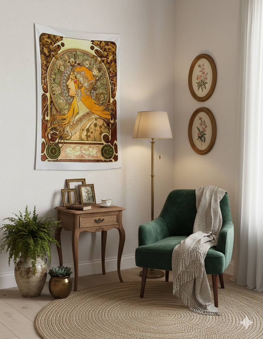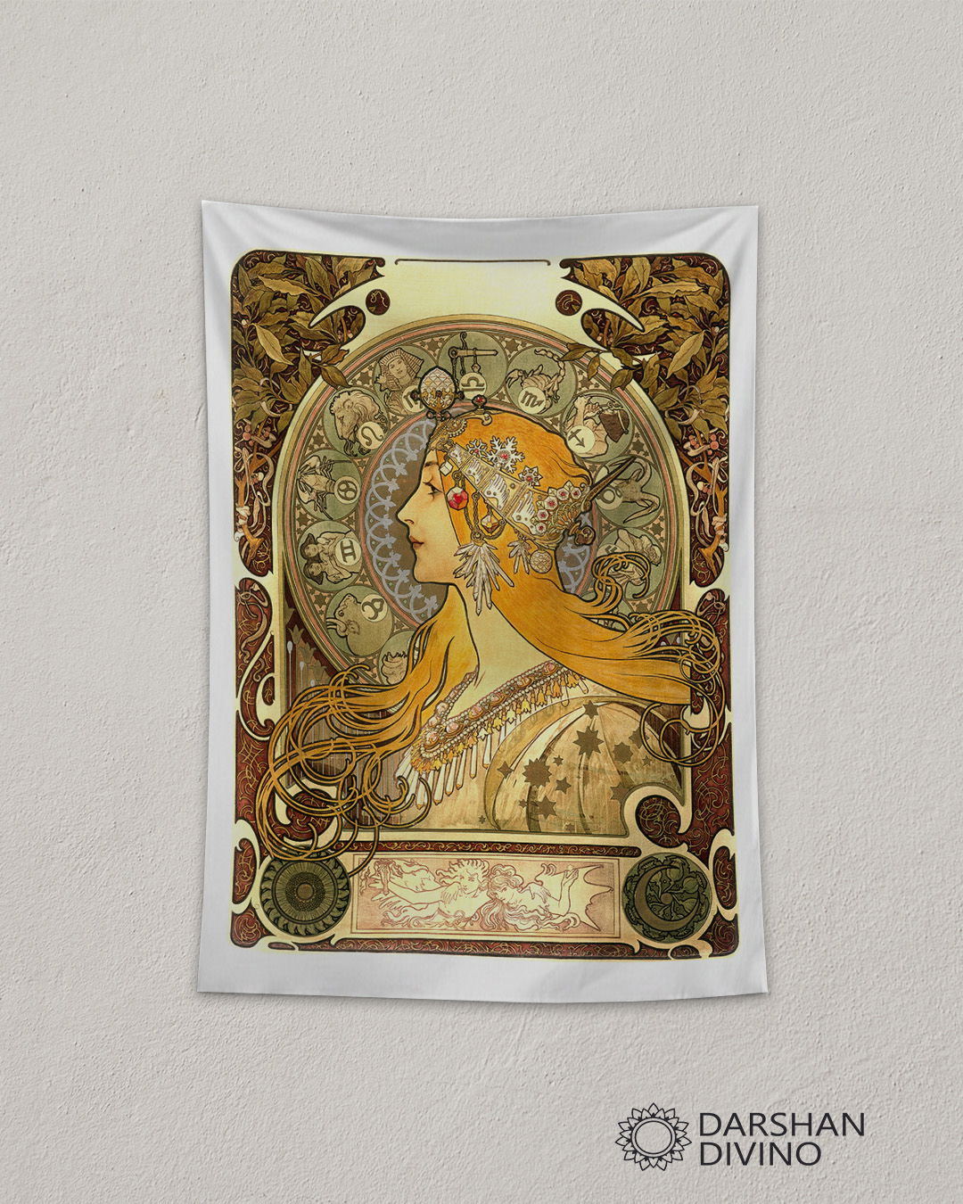 "Zodiac" fue el primer trabajo de Mucha bajo su contrato con la impresora Champenois y fue originalmente diseñado como un calendario interno para la compañía. En esta composición, Mucha incorporó doce signos del zodiaco en el disco de halo detrás de la cabeza de la mujer, uno de los motivos habituales de Mucha. La majestuosa belleza de la mujer se destaca por su porte real y joyas elaboradas.