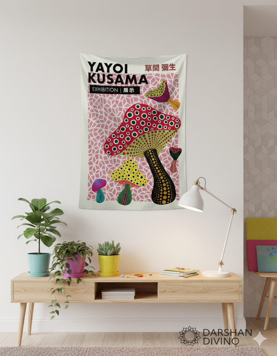 El motivo del hongo —frecuente en su obra— simboliza crecimiento, vida, pero también toxicidad y peligro, reflejando la tensión entre belleza y amenaza que Kusama explora a través de su visión única.