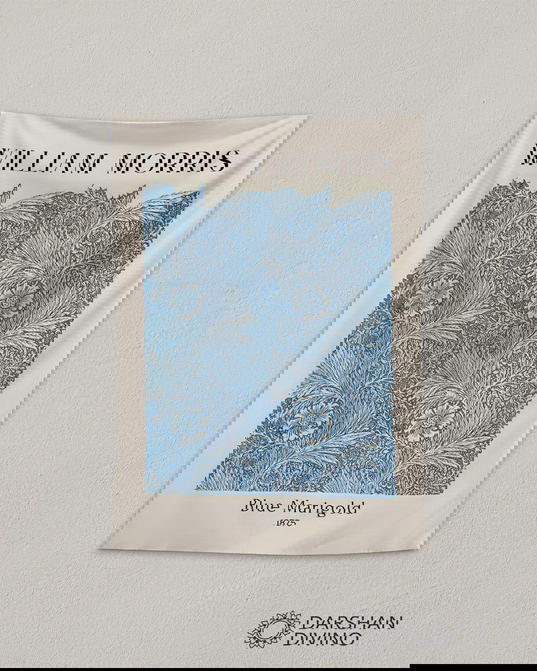 Un hermoso patrón de flores de caléndulas, diseñado por "William Morris" en 1875. Esta fina obra de arte botánica refleja el estilo del "movimiento Arts & Crafts", con flores y hojas intrincadas en una vibrante paleta de colores azul y blanco. Una decoración atemporal para el hogar o la oficina, ideal para los amantes del diseño vintage y los estampados clásicos.