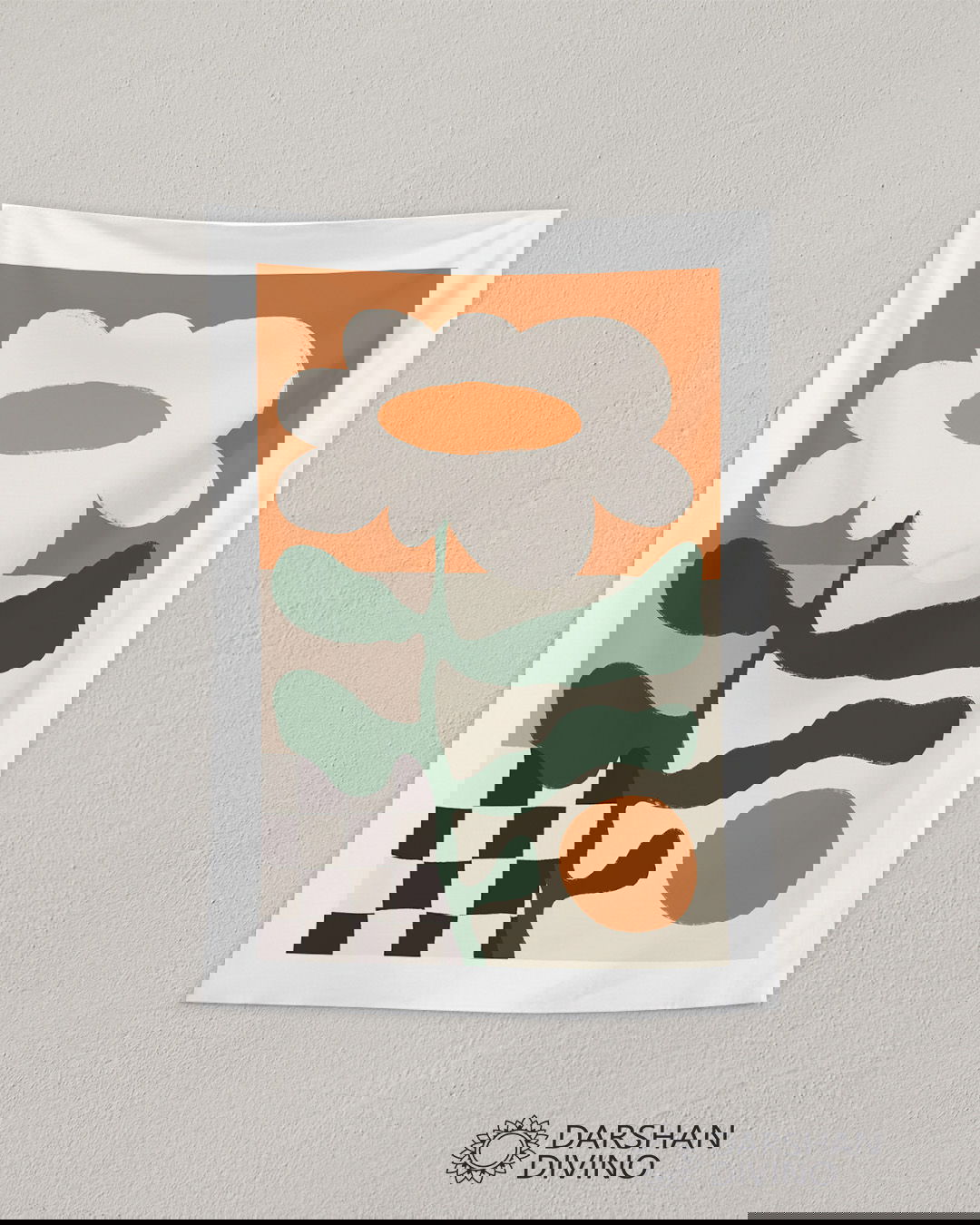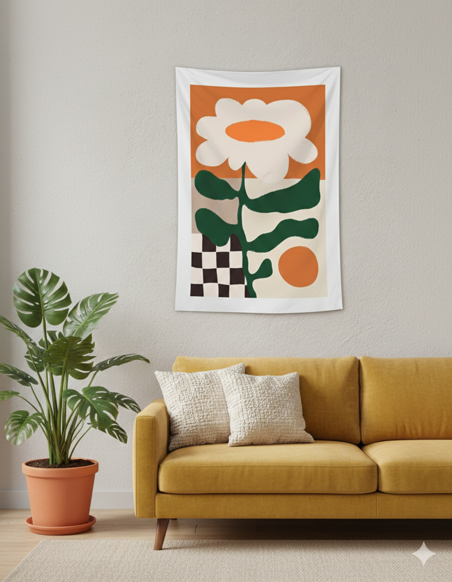 Este tapiz combina formas orgánicas y geométricas en una composición equilibrada y sofisticada. La flor estilizada, acompañada de contrastes cromáticos y patrones gráficos, aporta frescura y personalidad, convirtiéndose en una pieza versátil que realza la decoración con un aire artístico y contemporáneo.