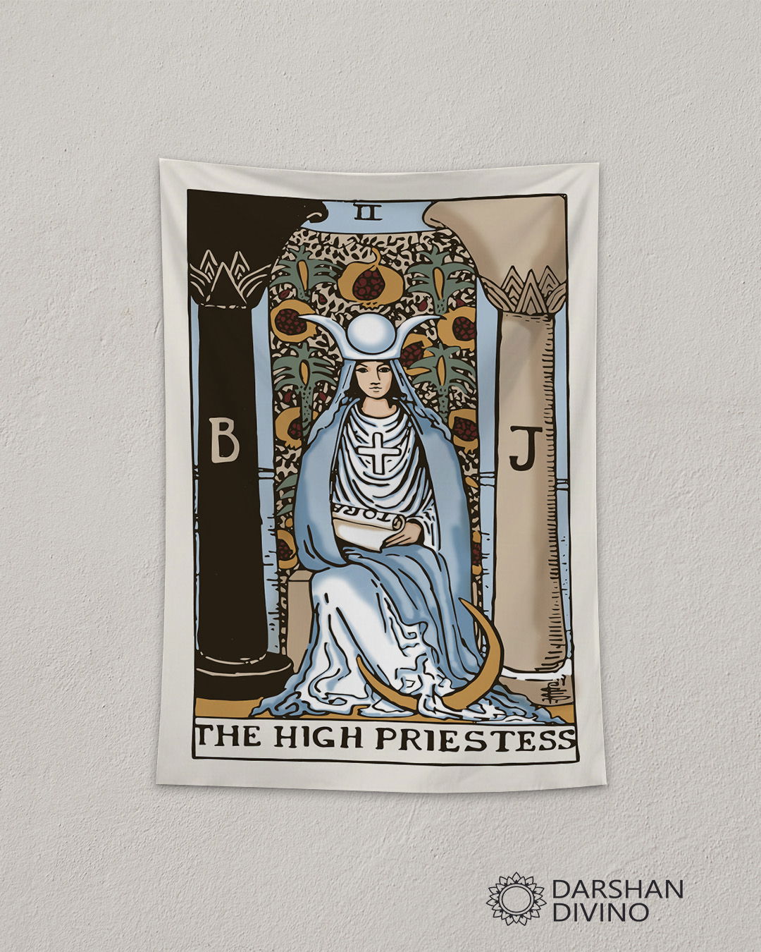 Guardiana de tu mundo interior 🌙✨ Llevá el misterio y la sabiduría de La Sacerdotisa a tu espacio personal. Esta versión a color resalta los azules profundos y la serenidad de su mirada, creando el ambiente perfecto para la introspección y la meditación. Confeccionado en tela suave con caída natural, es el diseño ideal para tu rincón de lectura o altar. Dejá que el conocimiento oculto y la intuición fluyan en tu hogar.