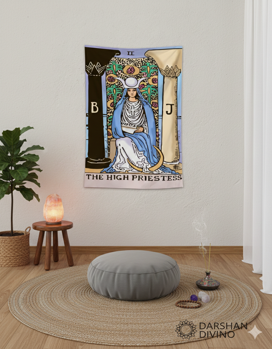 Tu portal a la intuición en tonos pastel 🌙✨ Descubrí el silencio y la paz interior con nuestro tapiz de La Sacerdotisa edición Pastel Rider. Esta versión transforma el misterio del arcano II en una pieza de decoración delicada, donde los tonos lilas y celestes crean una atmósfera de serenidad absoluta. Confeccionado en tela suave con caída natural, es el diseño ideal para tu rincón de lectura, meditación o para darle un toque aesthetic y místico a tu cuarto. ¡Dejá que tu sabiduría interna florezca con estilo!