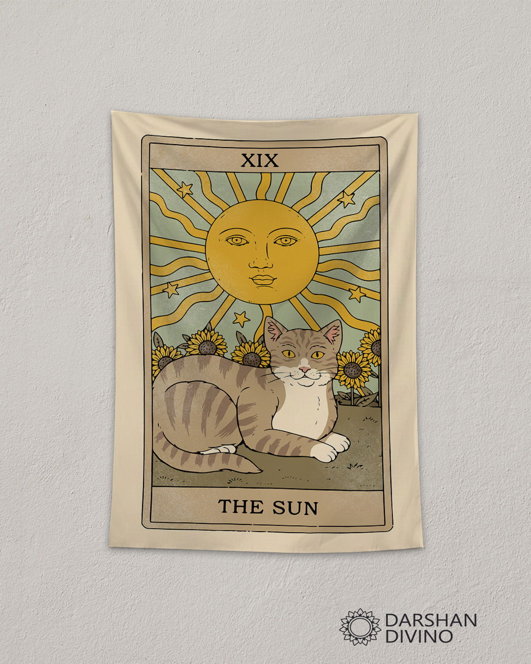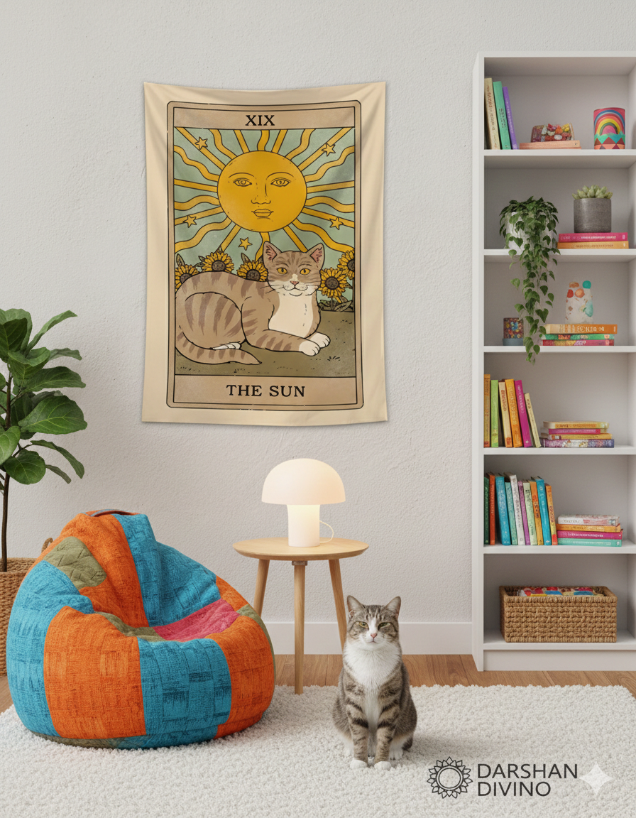 Un rayito de sol con bigotes ☀️🐾 No hay nada que dé más paz que ver a un gatito disfrutando del sol, y nuestro tapiz de El Sol versión gatuna lo captura a la perfección. Con sus girasoles y su vibra positiva, es el diseño ideal para llenar de luz y buena energía cualquier habitación. Hecho en tela suave con caída natural, este michi atigrado es el amuleto de felicidad que tu pared estaba esperando. ¡Imposible no sonreír al verlo!