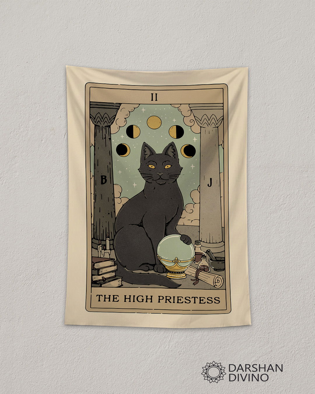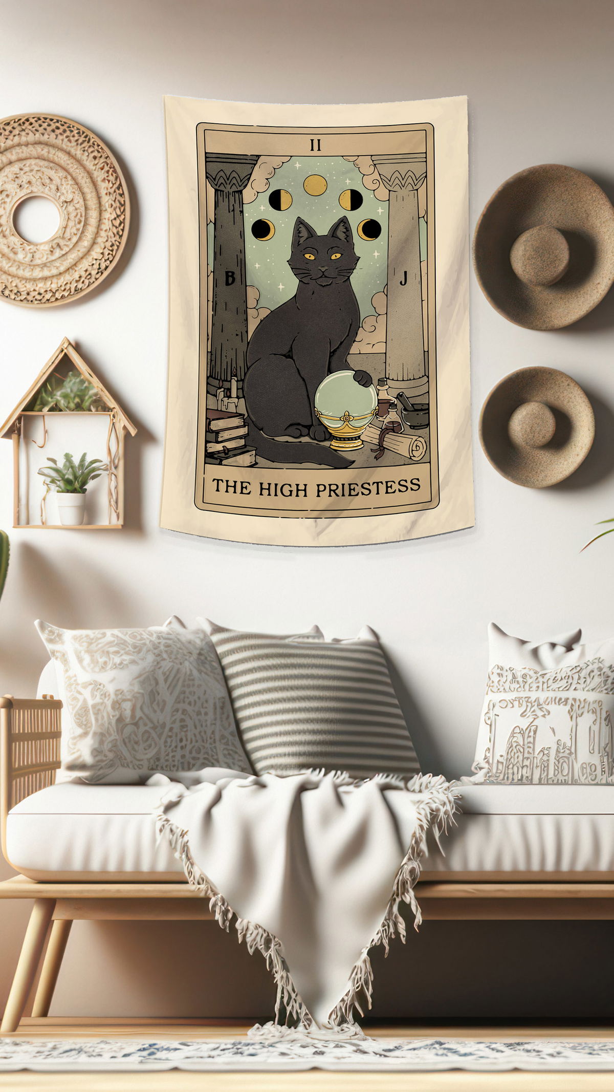 La guardiana de los secretos 🐈⬛🔮 Dejá que la sabiduría felina guíe tu intuición con nuestro tapiz de La Sacerdotisa versión Cat Tarot. Con un imponente gato negro custodiando su bola de cristal entre las columnas del conocimiento, este diseño es el amuleto ideal para tu espacio de meditación o lectura. Hecho en tela suave con caída natural, combina el misterio de las fases lunares con la elegancia vintage que tu habitación necesita. ¡Despertá tu magia interior!