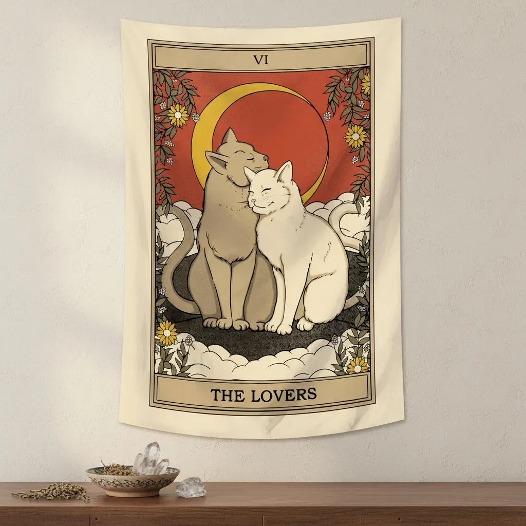 Compañeros de vida y de magia 🐾💕 No hay amor más sincero que el de nuestros michis, y el tapiz de Los Enamorados versión Cat Tarot lo celebra de la forma más tierna posible. Con sus tonos cálidos y una estética vintage irresistible, es el diseño perfecto para decorar tu cuarto o ese rincón especial que compartís con tu persona (o mascota) favorita. Hecho en tela suave con caída natural, este tapiz es un abrazo visual que llena tu hogar de armonía y buenas vibras. ¡El regalo ideal para los enamorados de los gatos!