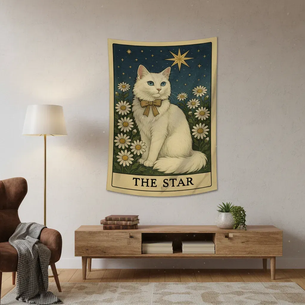 Un deseo cumplido en forma de michi 🌟🐾 Si buscabas una pieza que combine la pureza de la esperanza con la elegancia felina, nuestro nuevo tapiz The Star es para vos. Con un gatito blanco de pelaje sedoso rodeado de margaritas bajo un cielo azul profundo, este diseño transmite una paz y una claridad inigualables. Hecho en tela premium con esa caída suave que tanto nos piden, es el detalle ideal para transformar tu cuarto en un refugio lleno de luz y sueños. ¡Dejá que este guardián de ojos azules guíe tu camino!