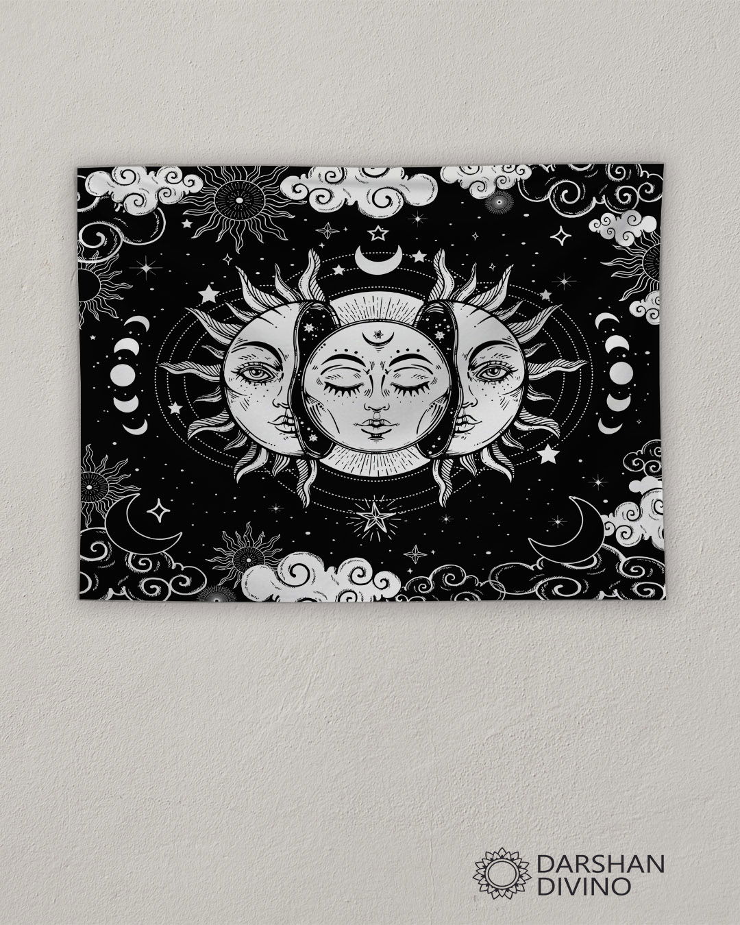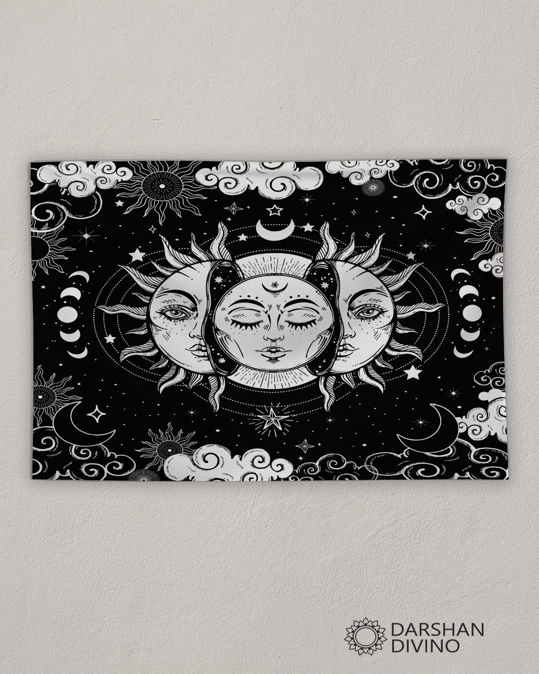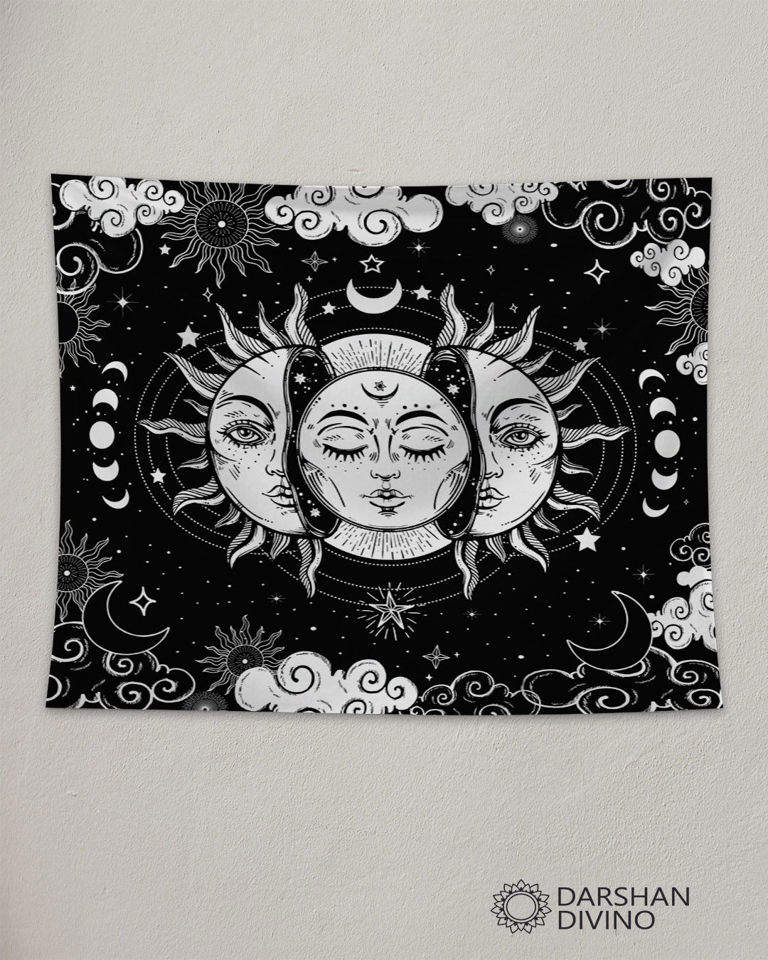 El equilibrio del cosmos en tu hogar ☀️🌙 Día y noche, luz y sombra. Este tapiz captura la danza eterna del Sol y la Luna en un diseño lleno de detalles astronómicos y nubes místicas. Es la pieza perfecta para crear un santuario de calma y reflexión en tu cuarto o living. Si sos fan de la estética mística clásica en blanco y negro, este diseño es para vos. ¡Conectá con la magia del universo!