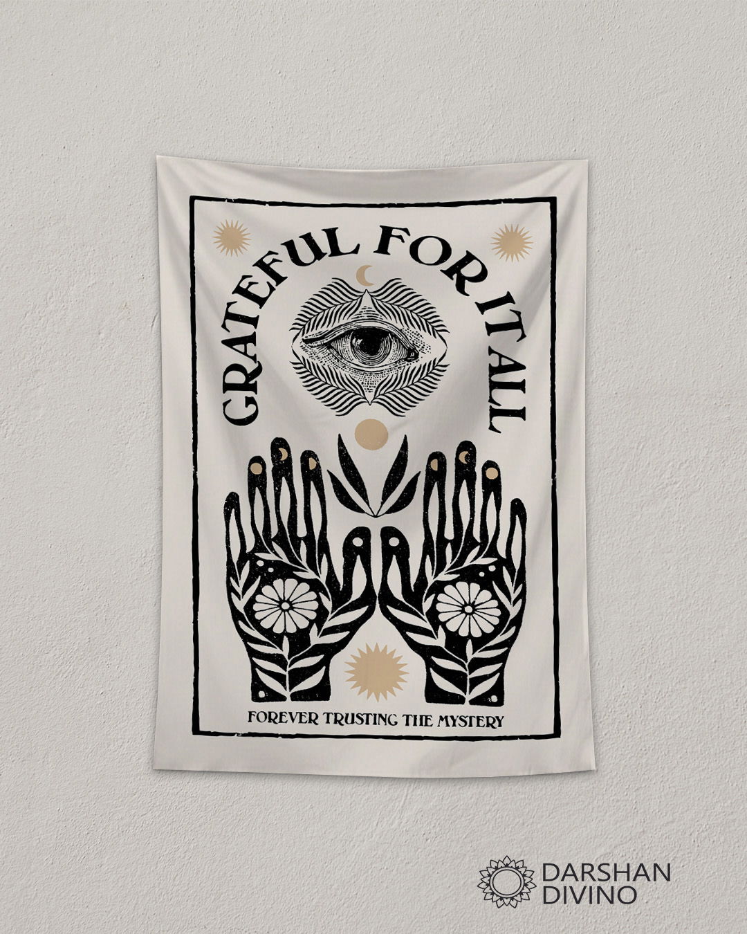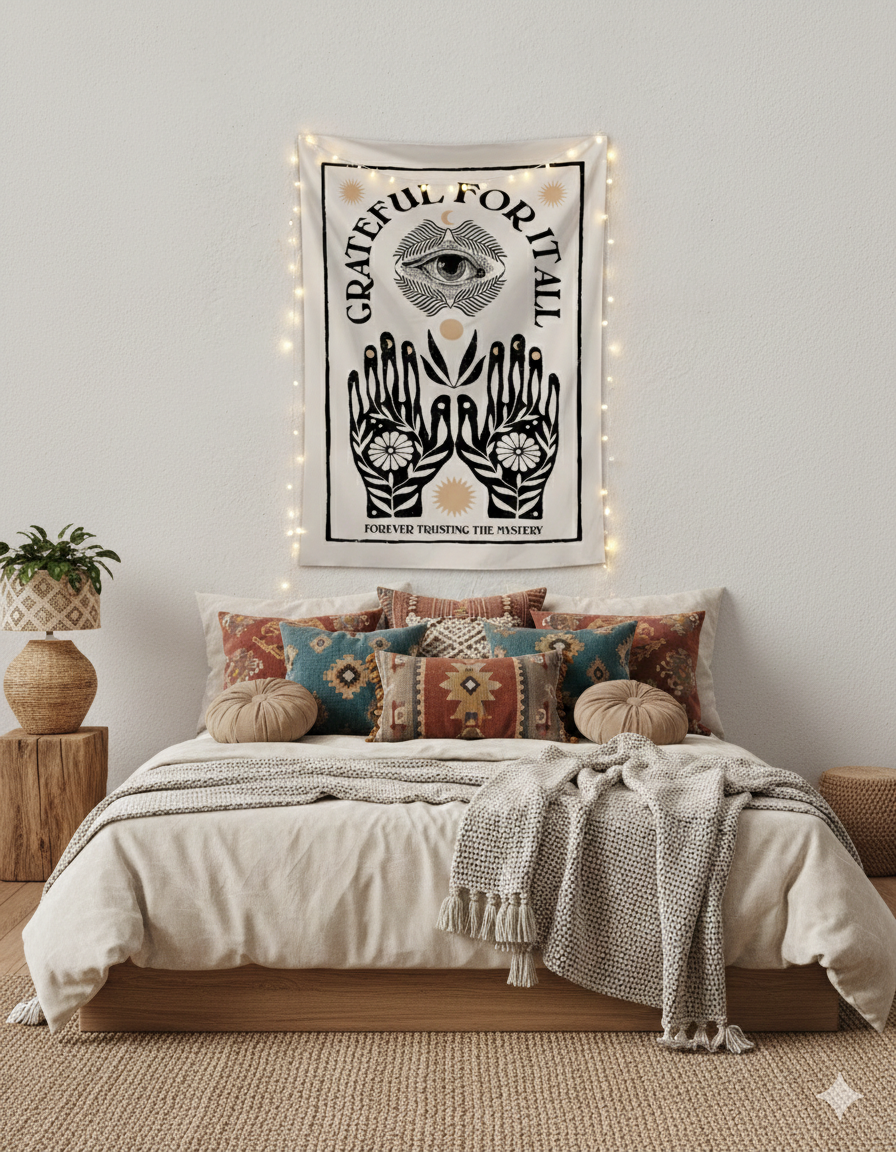 Agradecer es el imán de los milagros ✨ Hay diseños que hablan por nosotros. Nuestro tapiz #67 "Grateful For It All" es un homenaje a la confianza y la gratitud profunda. Con su ilustración de manos florecidas y el ojo de la sabiduría, es la pieza ideal para coronar tu altar, tu espacio de yoga o ese rincón donde empezás el día. "Forever trusting the mystery": un mantra visual para recordar que todo lo que llega tiene un propósito. ¡Llená tu hogar de luz y buenas intenciones!