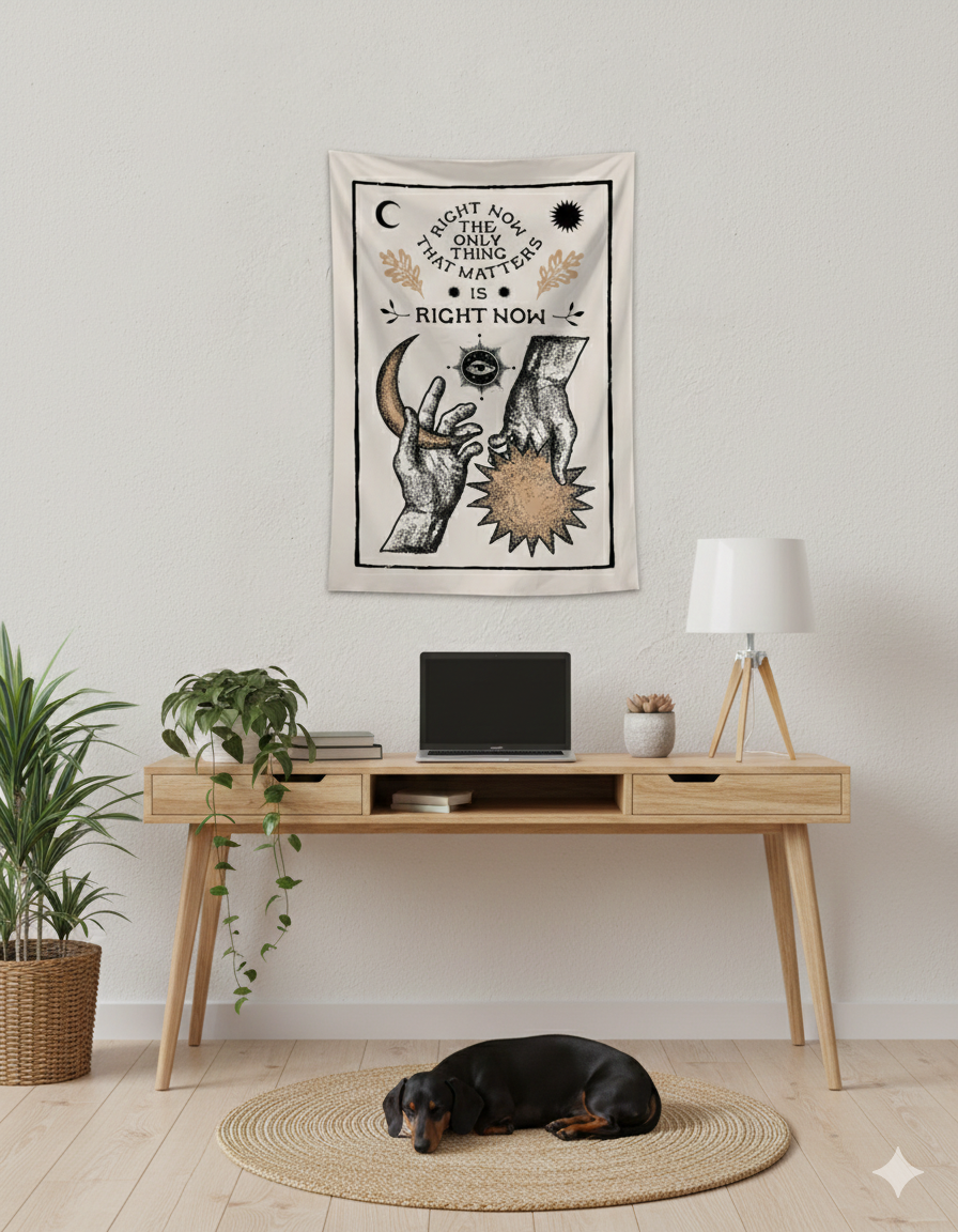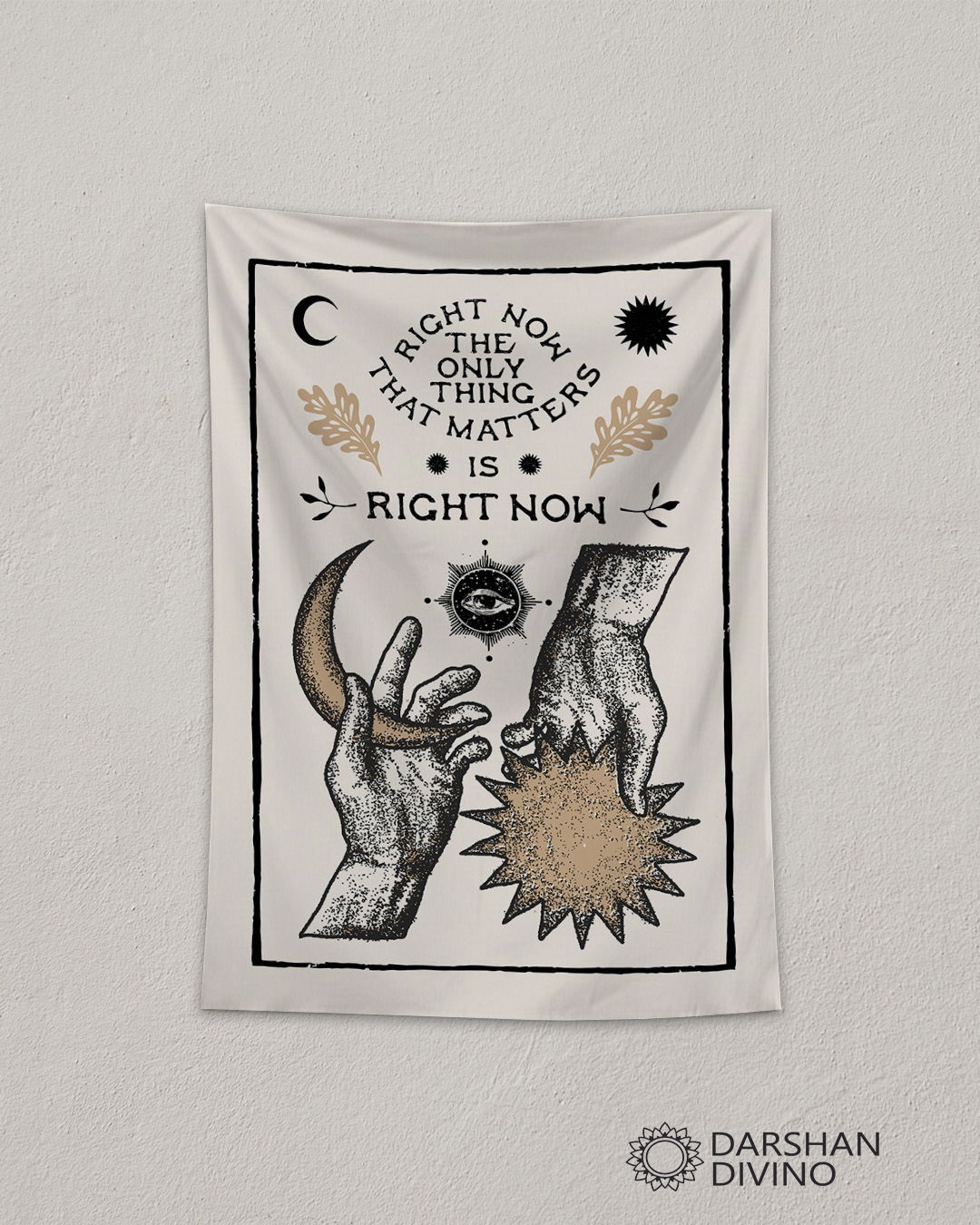 El único momento es hoy 🌙✨ A veces necesitamos un recordatorio de que la vida sucede en el presente. Nuestro tapiz "Right Now" captura esa esencia: una invitación a soltar el pasado y la ansiedad por el futuro. Con una ilustración artística de manos que sostienen la luna y el sol, y la frase "The only thing that matters is right now", es el complemento ideal para tu rincón de calma. ¡Rodeate de mensajes que te devuelvan a tu centro!