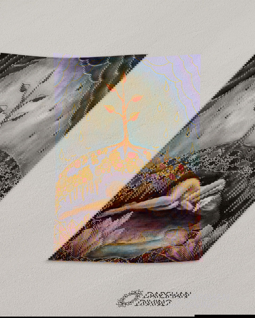 Nutrir la semilla, esperar el brote 🌱✨ Toda gran transformación comienza en el silencio y la oscuridad. Nuestro tapiz es un homenaje al poder creador de la vida y a los ciclos de descanso necesarios para florecer. Con una paleta de violetas profundos, dorados y tierras, esta pieza es ideal para acompañar espacios de sanación, dormitorios o rincones de lectura. Un recordatorio visual de que estamos conectados con las raíces del universo. ¡Dejá que tu espacio florezca!
