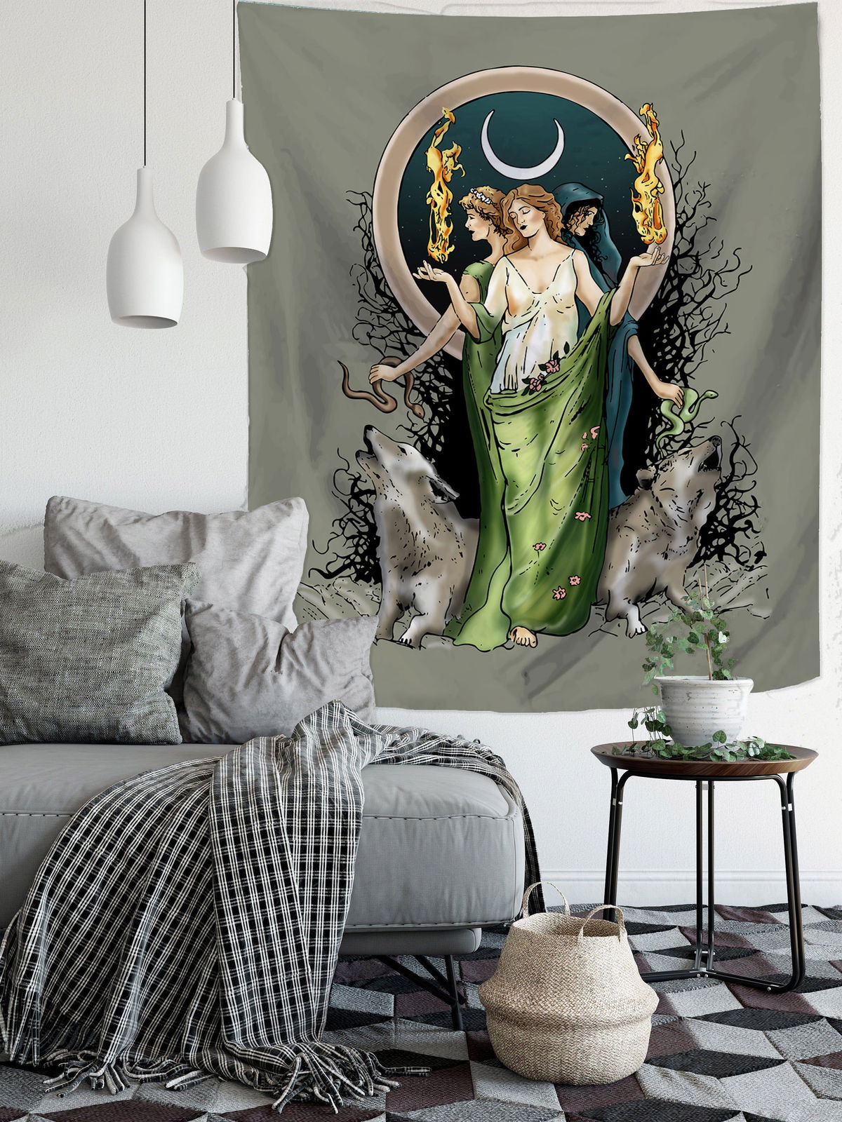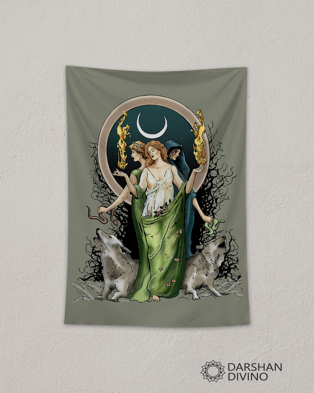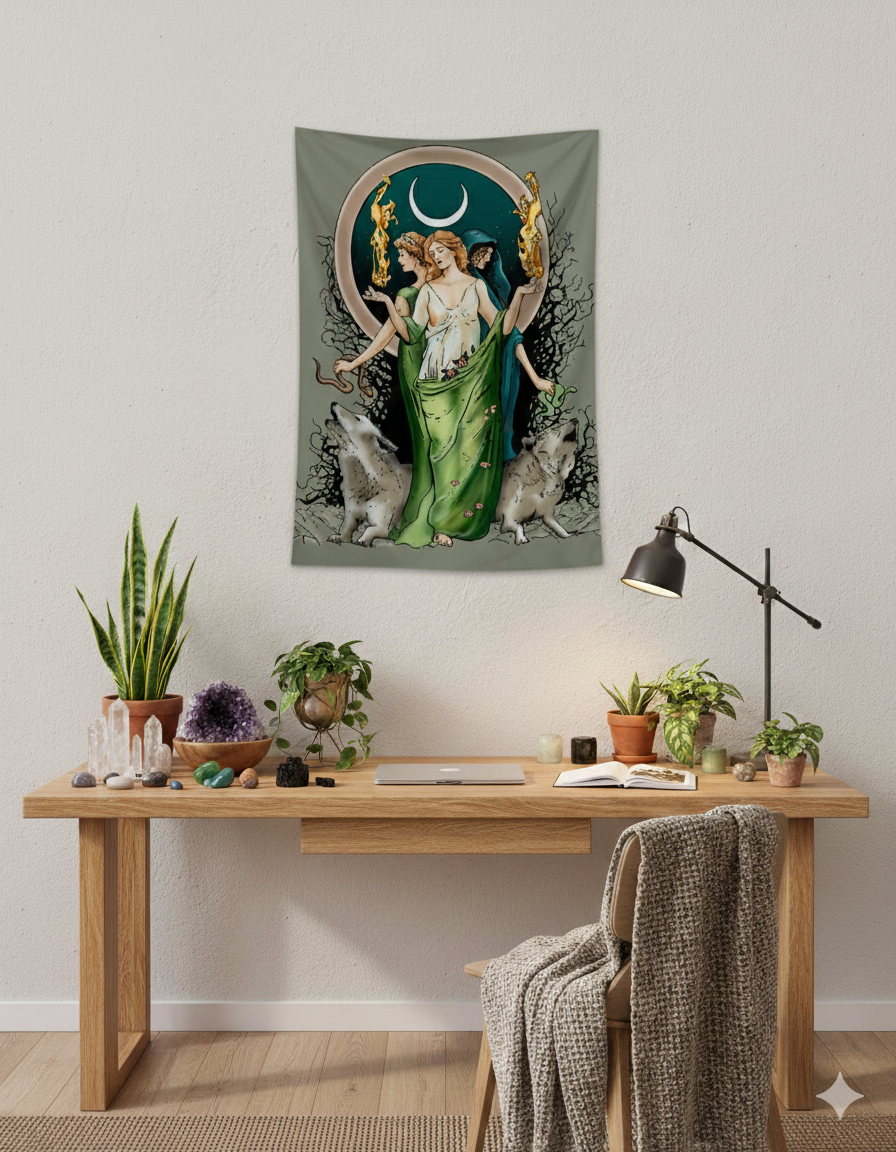 Este diseño captura la esencia de la deidad griega en sus tres formas, simbolizando las fases de la vida y el dominio sobre los caminos. La paleta de verdes musgo y sombras profundas crea un impacto visual elegante y misterioso. Confeccionado en tela premium con caída orgánica, es la pieza definitiva para decoraciones con un trasfondo histórico y espiritual profundo.