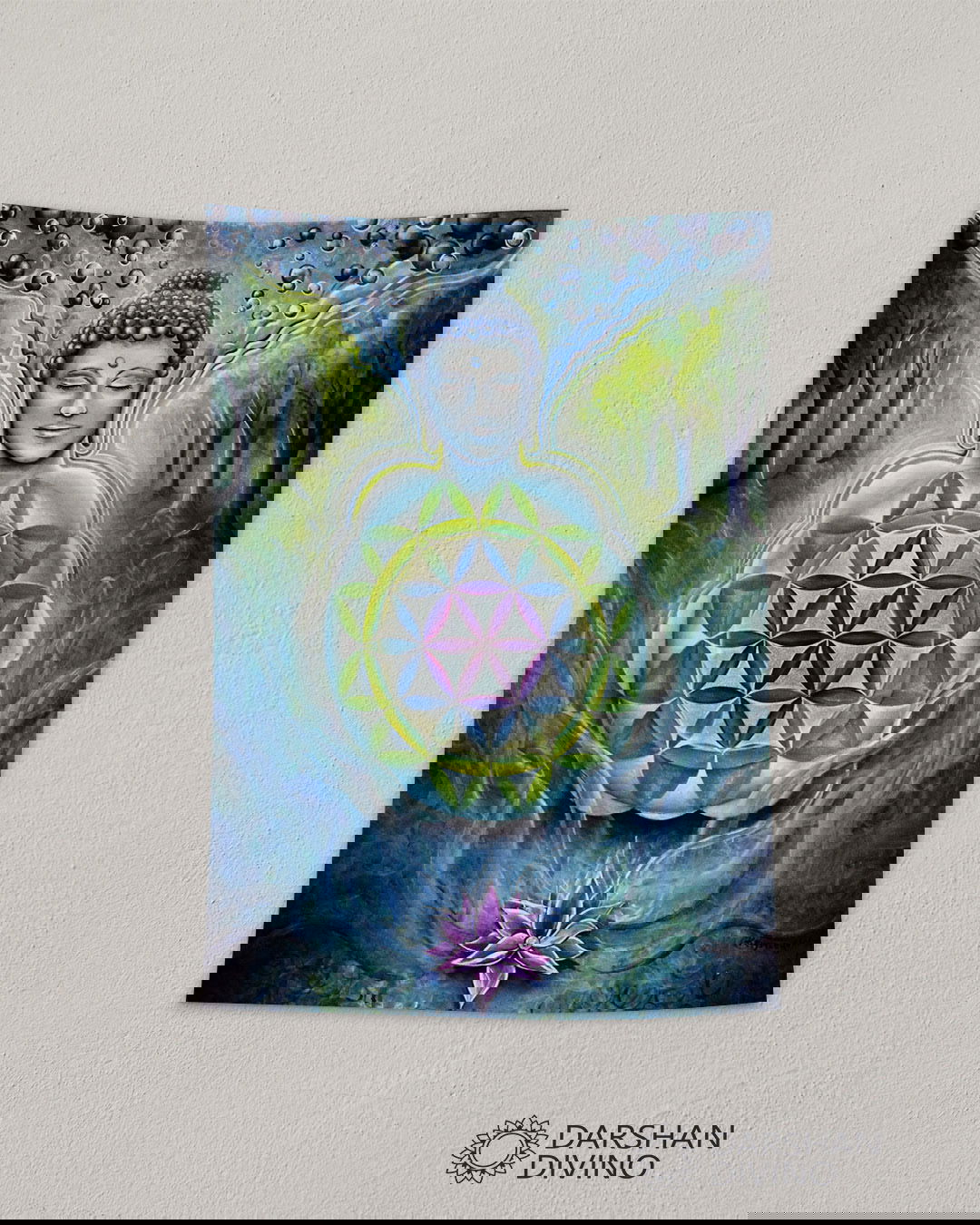 Este modelo destaca por la integración de la Flor de la Vida sobre el pecho del Buda, sugiriendo que la paz universal reside en nuestro centro. Los detalles de las burbujas de luz, el bosque místico de fondo y el loto púrpura en la base crean una composición rica en texturas y simbolismo de sanación. Es una pieza perfecta para armonizar ambientes y elevar la vibración del hogar.