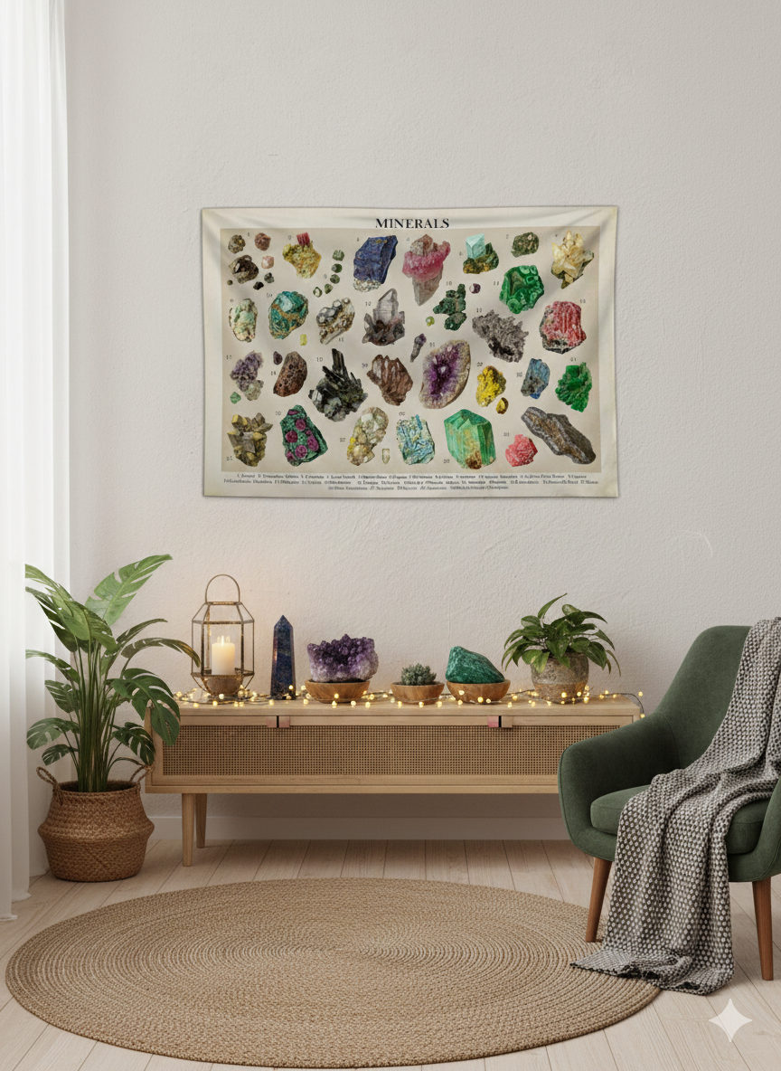 La fuerza de los cristales en tu pared ✨💎 ¿Sentís una conexión especial con la energía de la tierra? Nuestro tapiz "Minerales" captura la belleza bruta y geométrica de las piedras más fascinantes del mundo. Con un aire vintage de museo de ciencias naturales, esta pieza llena tu espacio de colores vibrantes y una sensación de equilibrio natural. Ideal para presidir tu rincón de meditación, un estudio o para acompañar tu colección de cristales reales. ¡Un tesoro geológico para tu hogar! 🌍💜