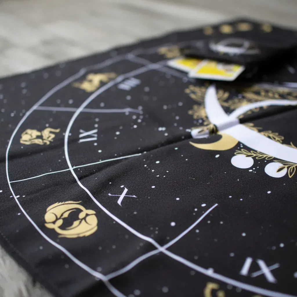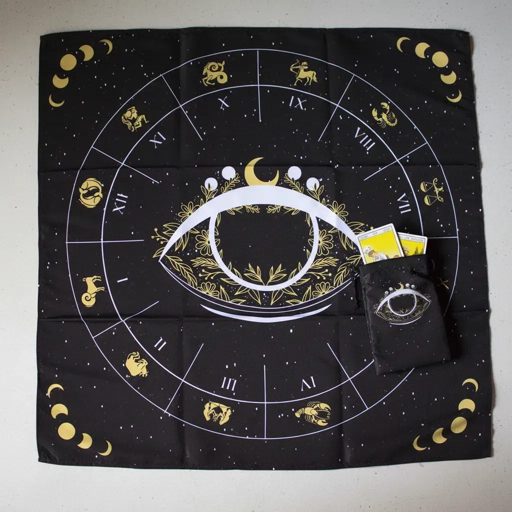 "Conecta con la sabiduría del cosmos a través de este diseño exclusivo que integra el Ojo de la Providencia central, rodeado por la rueda de los doce signos del zodiaco y las fases lunares en los extremos. Este paño es ideal para quienes buscan una guía astrológica en sus lecturas, permitiendo situar las cartas en resonancia con las energías planetarias y la protección mística del tercer ojo."