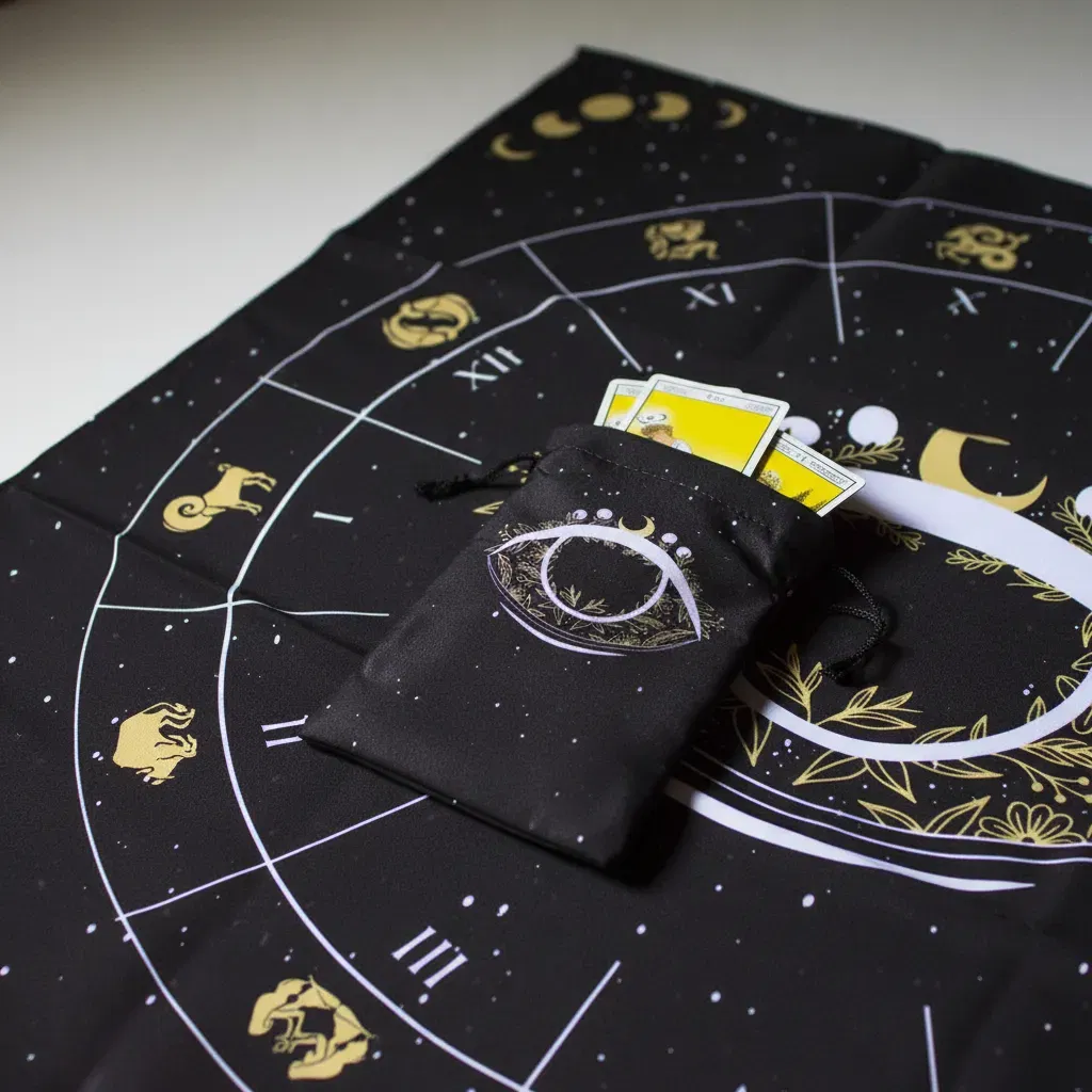 2. Bolsa para Cartas haciendo juego: Incluye una funda de 18cm x 10cm aprox. con el mismo estampado, perfecta para proteger tu mazo (Rider Waite, Marsella, Oráculos) y mantener su energía resguardada.