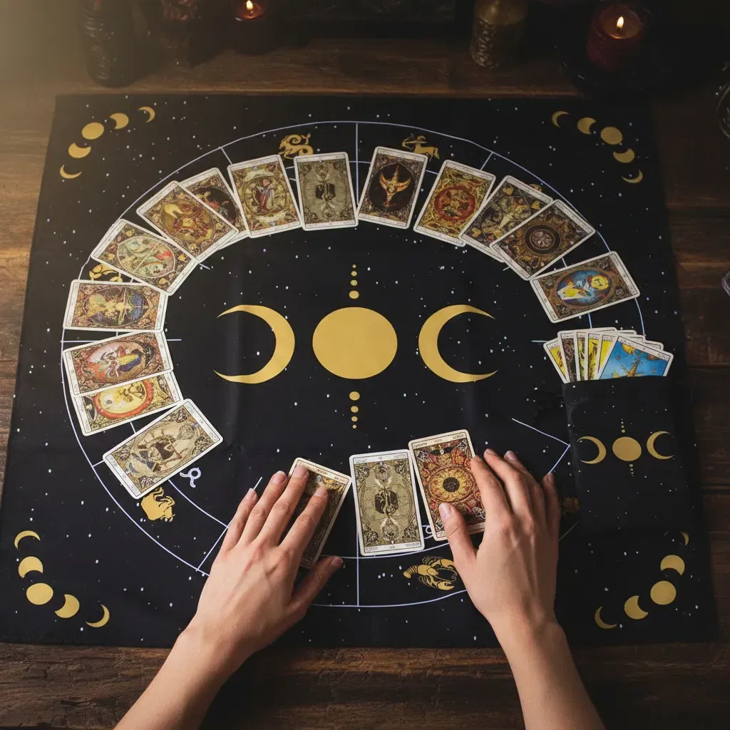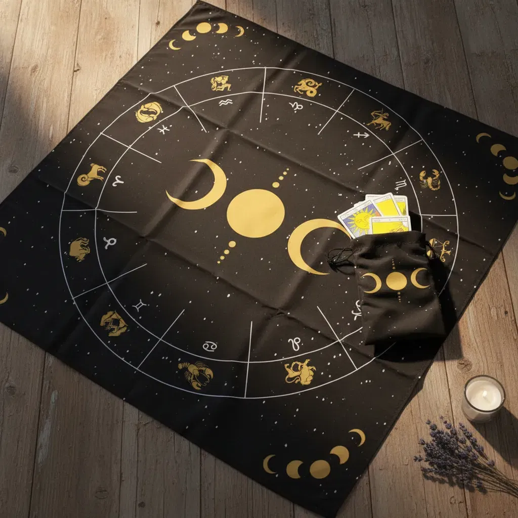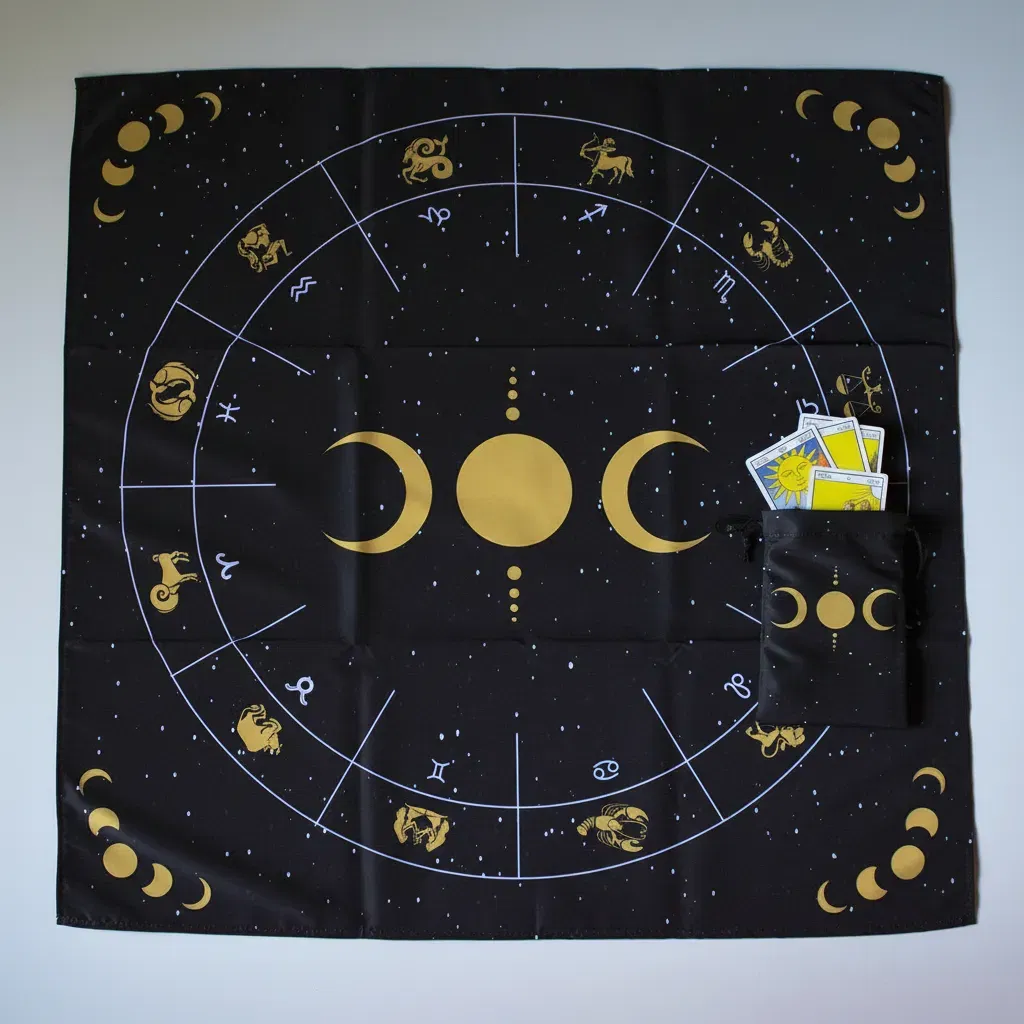1. Paño de Lectura Profesional: Con una medida de 70cm x 70cm, ideal para realizar desde tiradas rápidas de tres cartas hasta despliegues complejos.