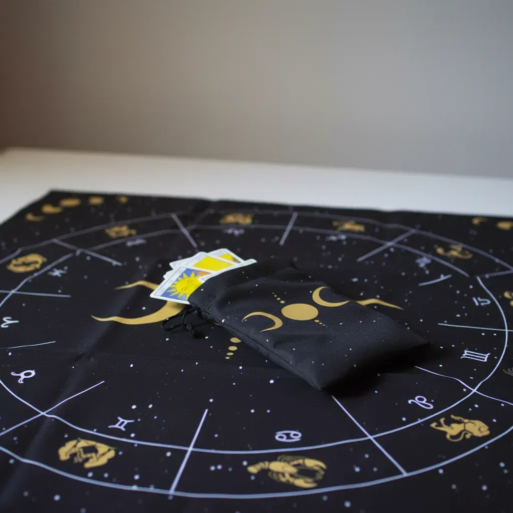2. Bolsa para Cartas haciendo juego: Incluye una funda de 18cm x 10cm aprox. con el mismo estampado, perfecta para proteger tu mazo (Rider Waite, Marsella, Oráculos) y mantener su energía resguardada.