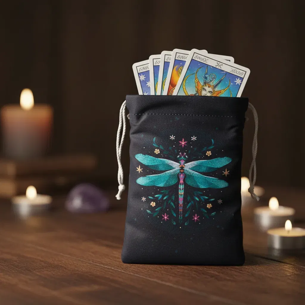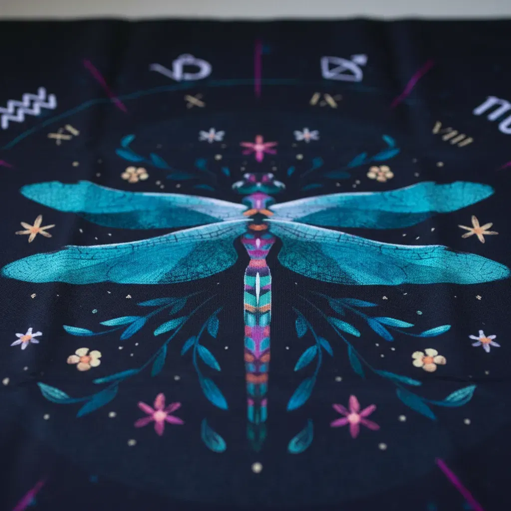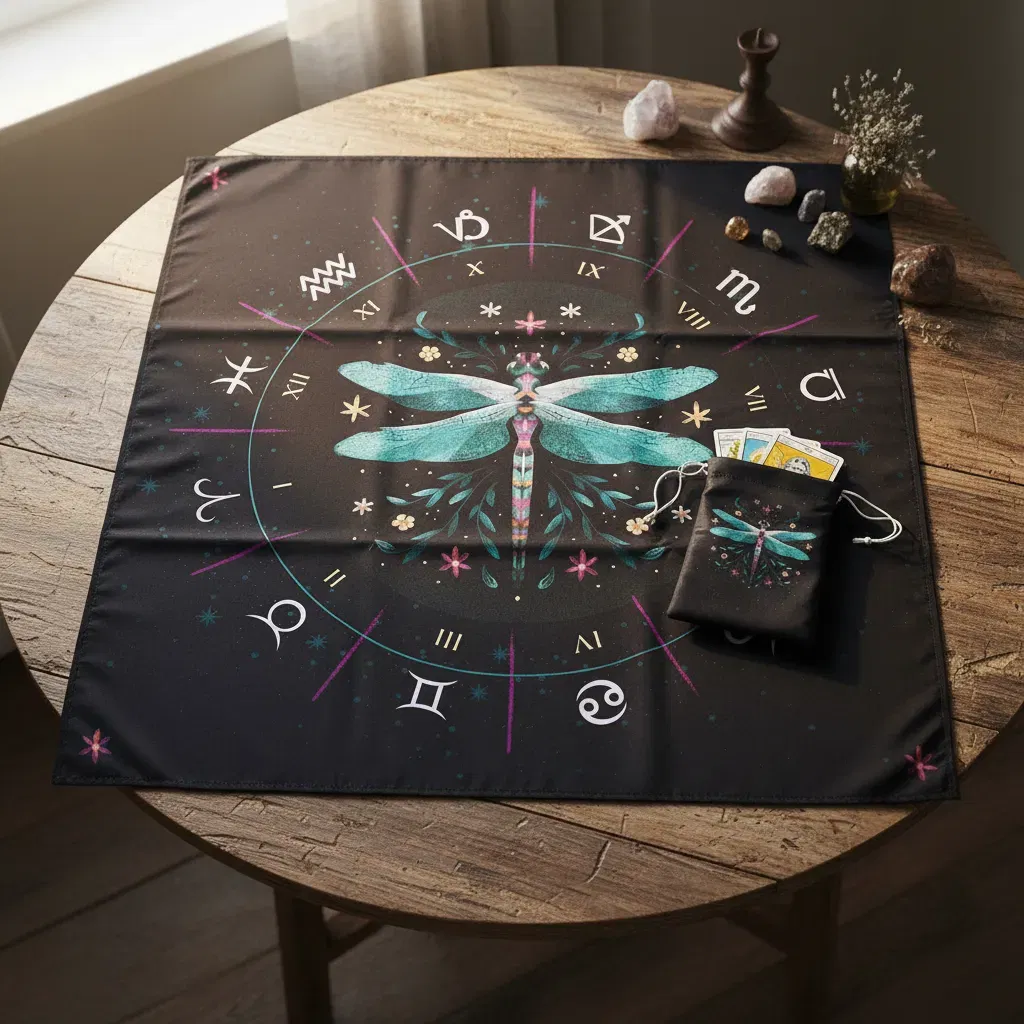 "Conectá con la ligereza y la adaptabilidad espiritual. Este diseño único presenta una libélula central en tonos turquesa y rosado, rodeada de un delicado follaje botánico y la rueda zodiacal. Es el tapete ideal para quienes buscan lecturas llenas de claridad, cambio positivo y una estética mágica y colorida."