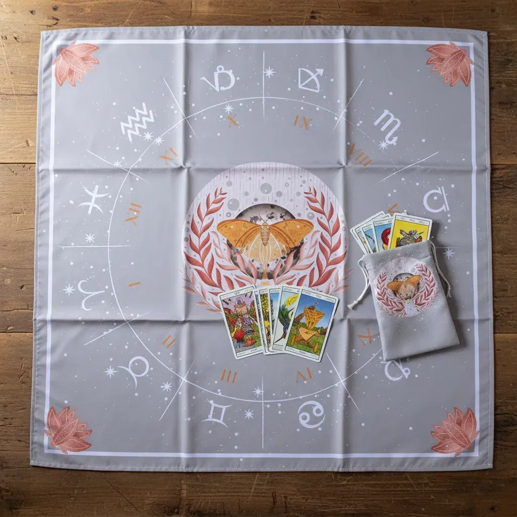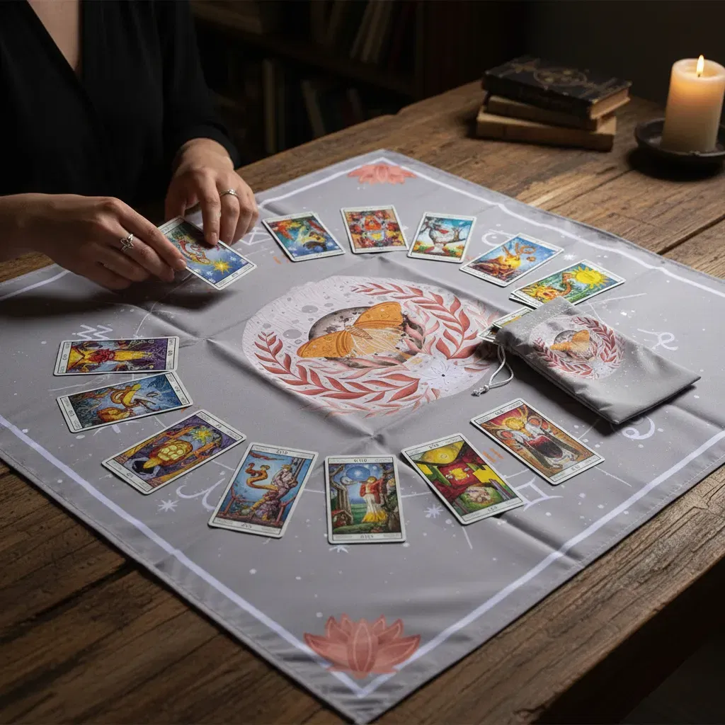 Paño de Lectura Profesional: Con una medida de 70cm x 70cm, ideal para realizar desde tiradas rápidas de tres cartas hasta despliegues complejos.
