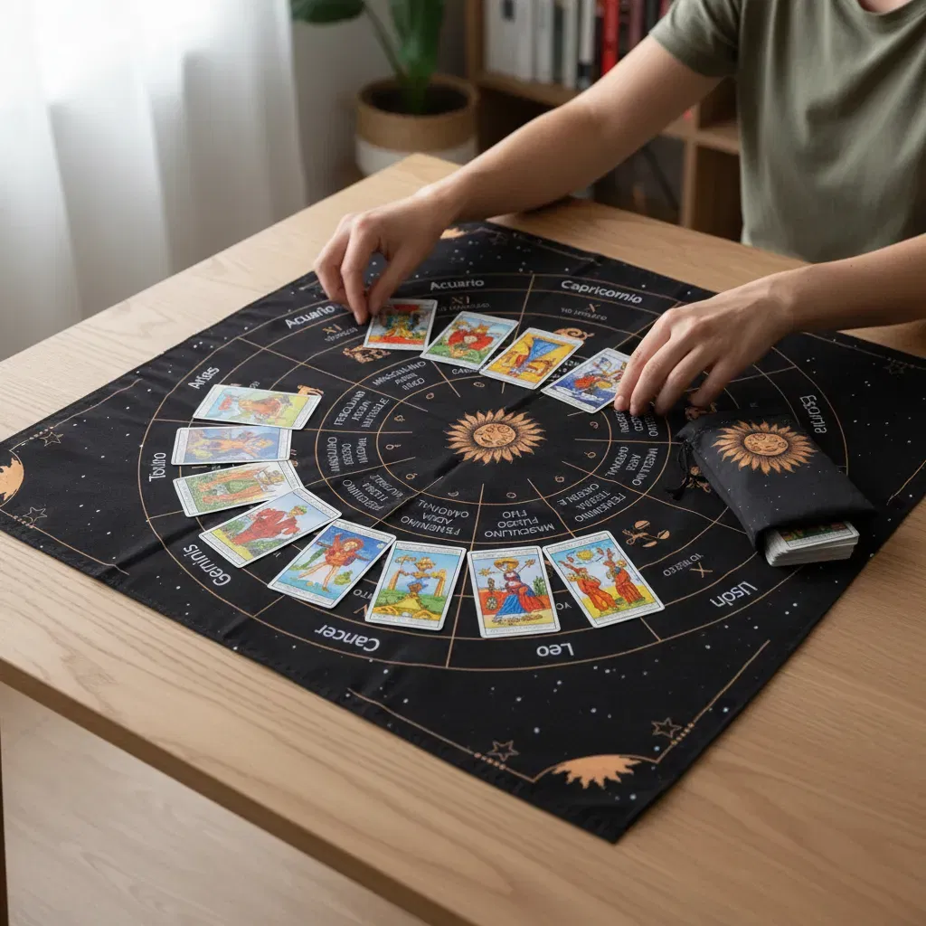 Paño de Lectura Profesional: Con una medida de 70cm x 70cm, ideal para realizar desde tiradas rápidas de tres cartas hasta despliegues complejos.