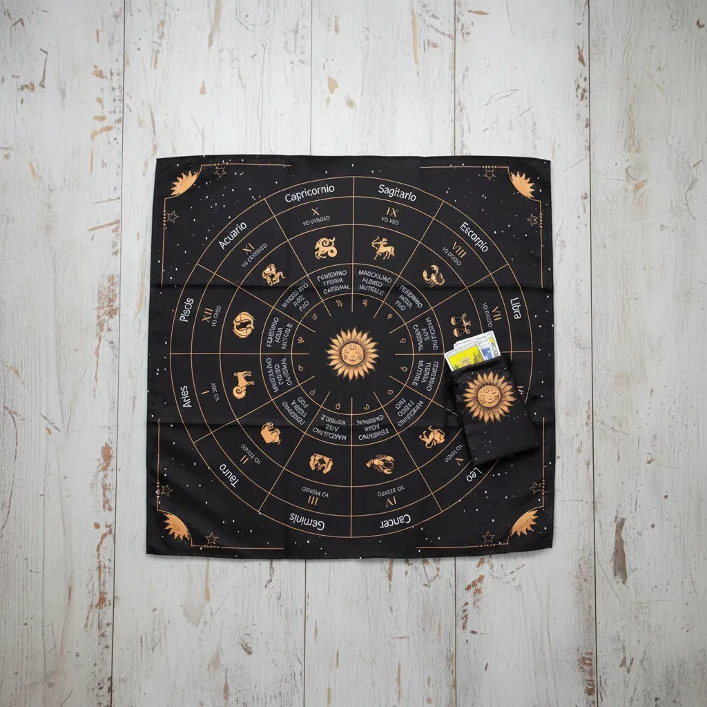 "Llevá tus lecturas a un nivel profesional con el paño más completo de nuestra colección. Este diseño en español incluye las casas astrológicas, polaridades (masculino/femenino), modalidades y frases afirmativas de cada signo. Es la herramienta educativa y ritual definitiva para quienes integran la astrología con el tarot de manera técnica y profunda."
