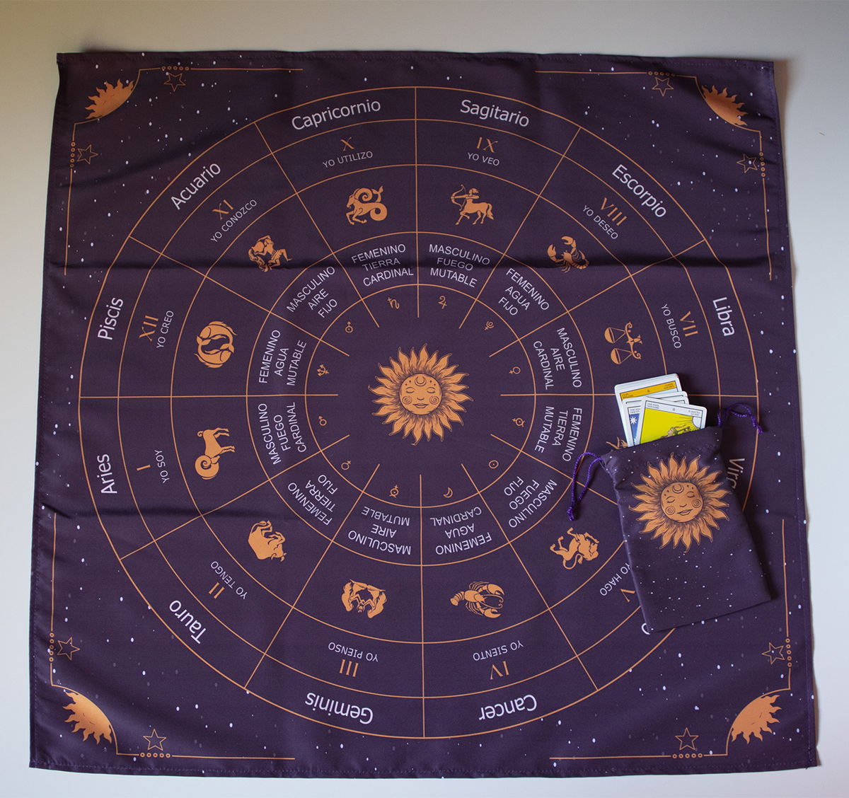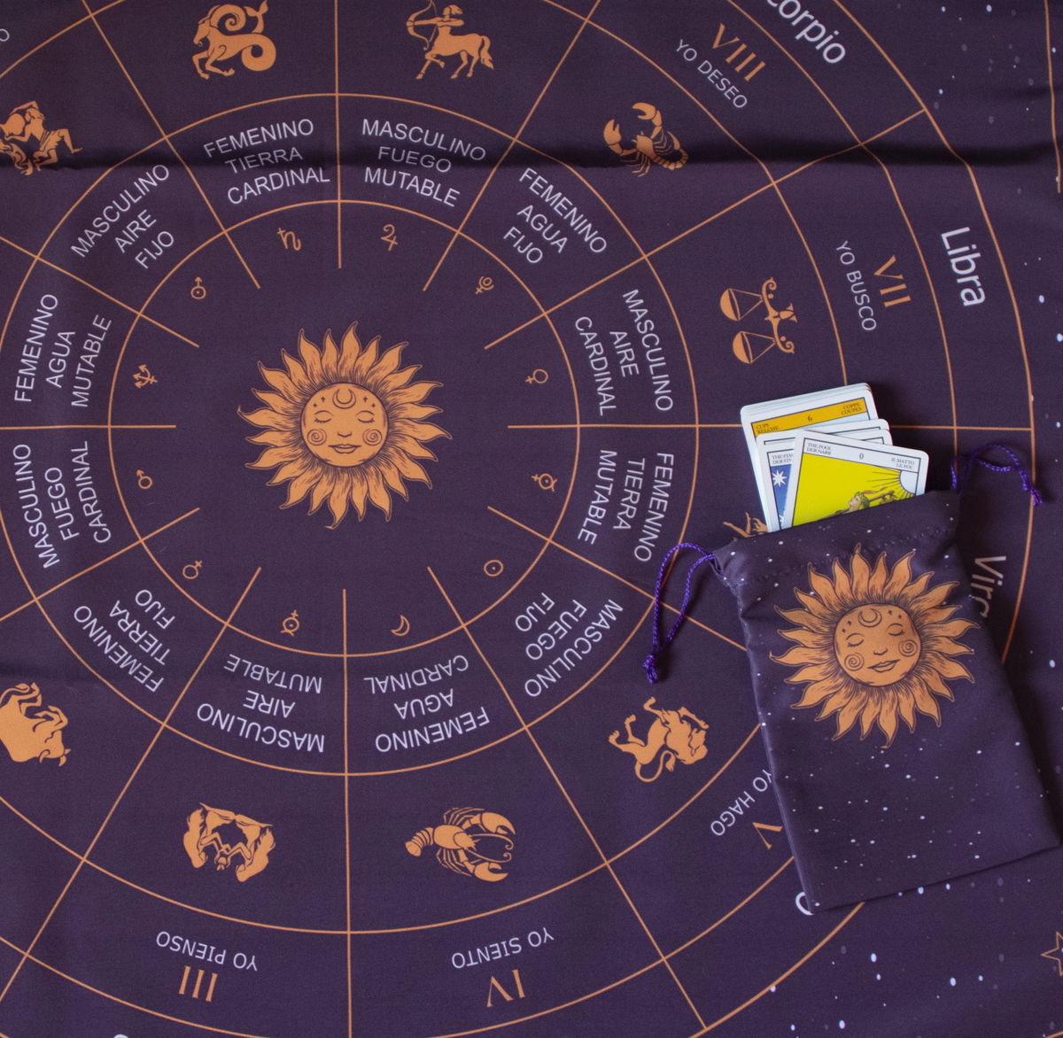 "Llevá tu práctica al siguiente nivel con el paño más completo de nuestra colección. Este diseño en español incluye las casas astrológicas, polaridades (femenino/masculino), modalidades y frases afirmativas para cada signo. Es la herramienta educativa y ritual definitiva para quienes integran la astrología con el tarot de manera técnica y profunda."
