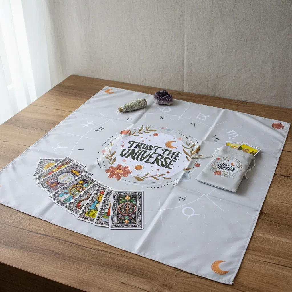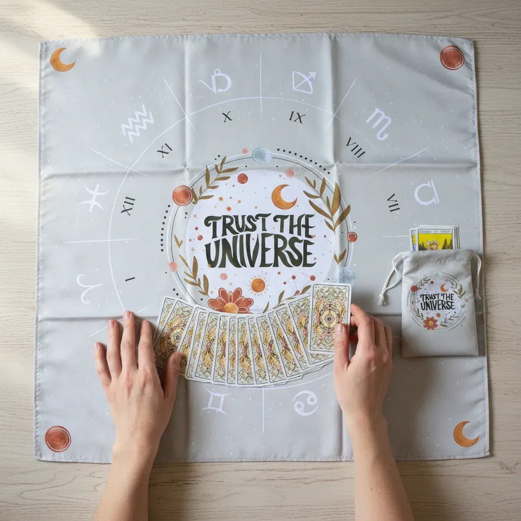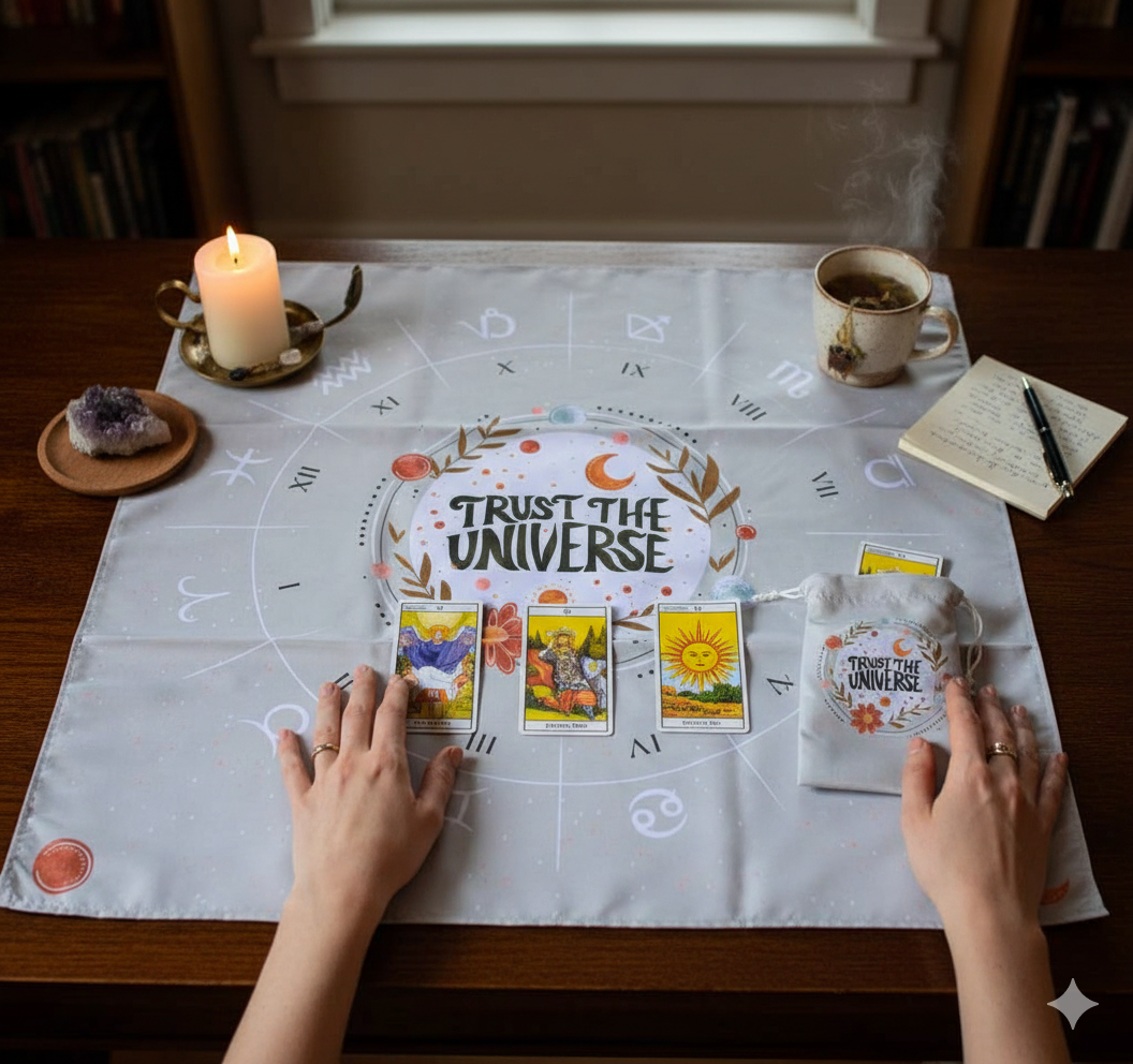 Paño de Lectura Profesional: Con una medida de 70cm x 70cm, ideal para realizar desde tiradas rápidas de tres cartas hasta despliegues complejos.