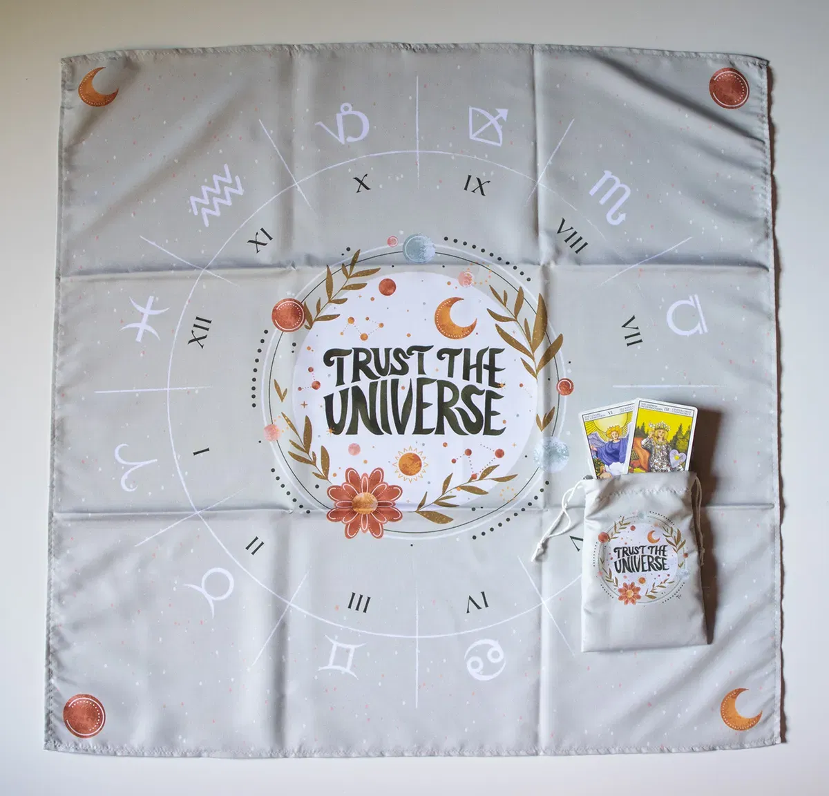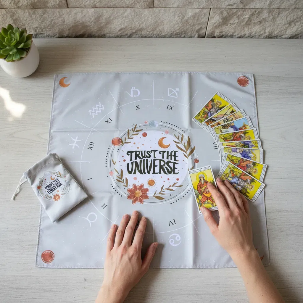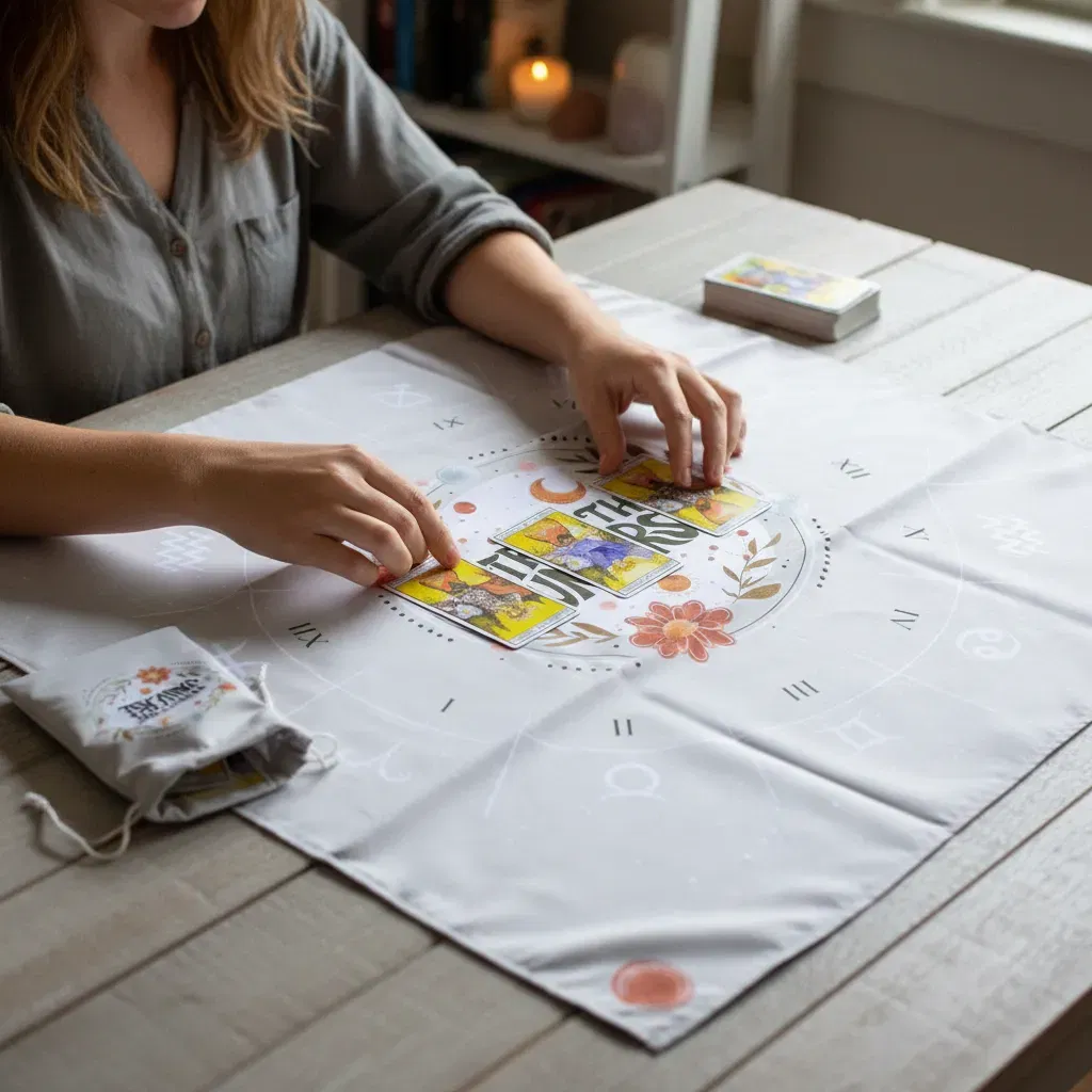 Paño de Lectura Profesional: Con una medida de 70cm x 70cm, ideal para realizar desde tiradas rápidas de tres cartas hasta despliegues complejos.