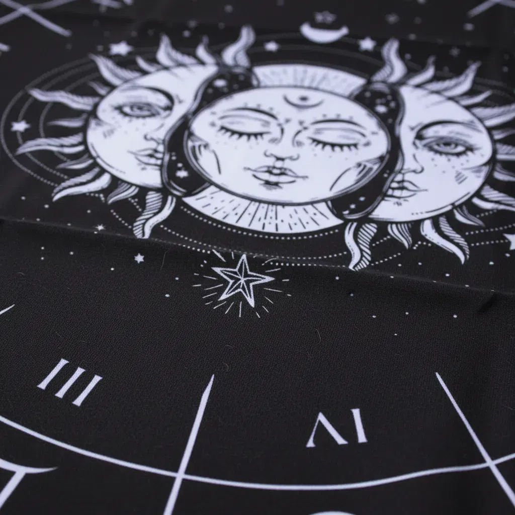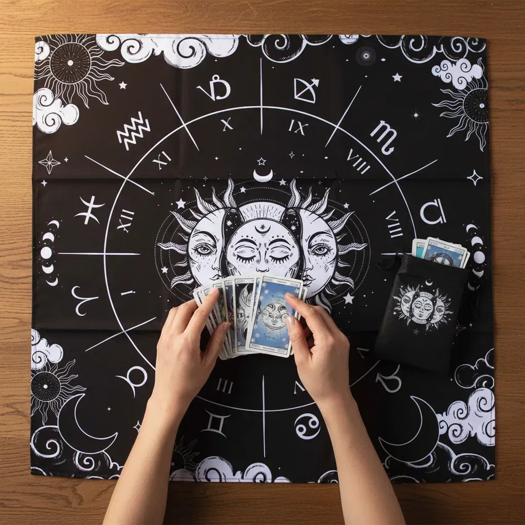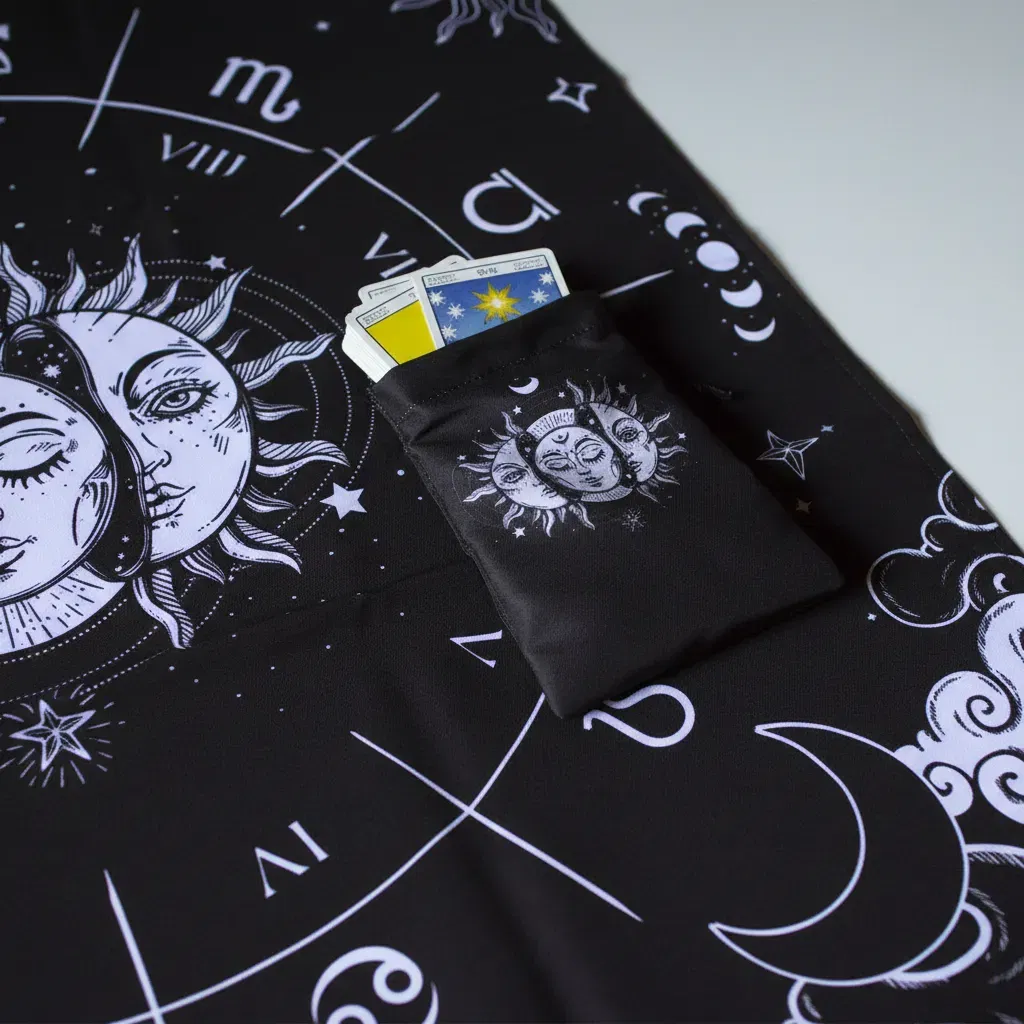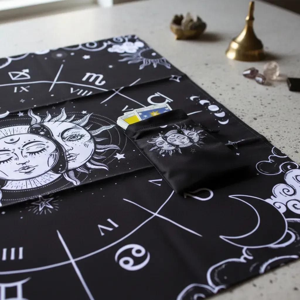 Paño de Lectura Profesional: Con una medida de 70cm x 70cm, ideal para realizar desde tiradas rápidas de tres cartas hasta despliegues complejos.