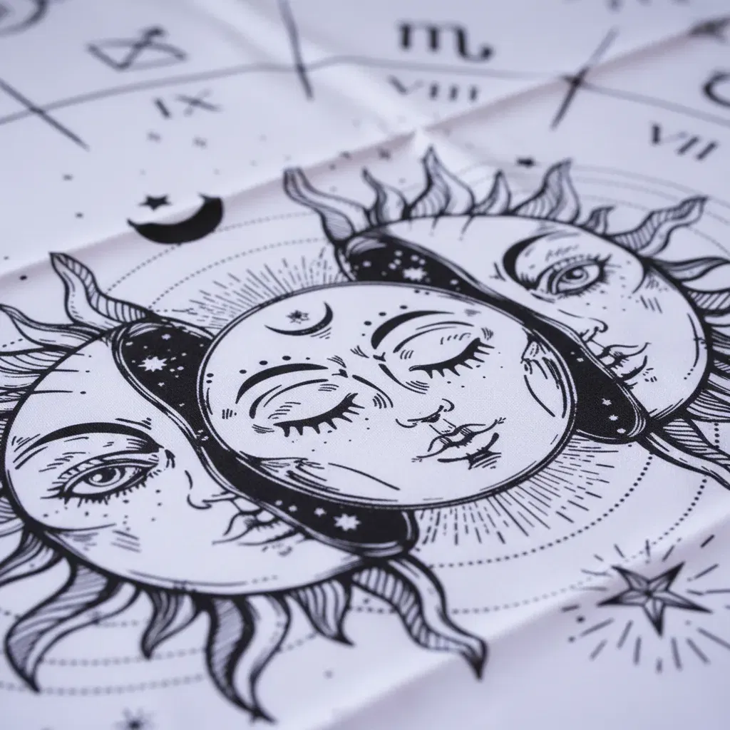 "Una estética de grabado antiguo para tu altar. Este diseño presenta una fusión mística de tres rostros celestiales rodeados de nubes, soles y lunas en las esquinas, creando una atmósfera de sabiduría ancestral para tus lecturas profesionales."