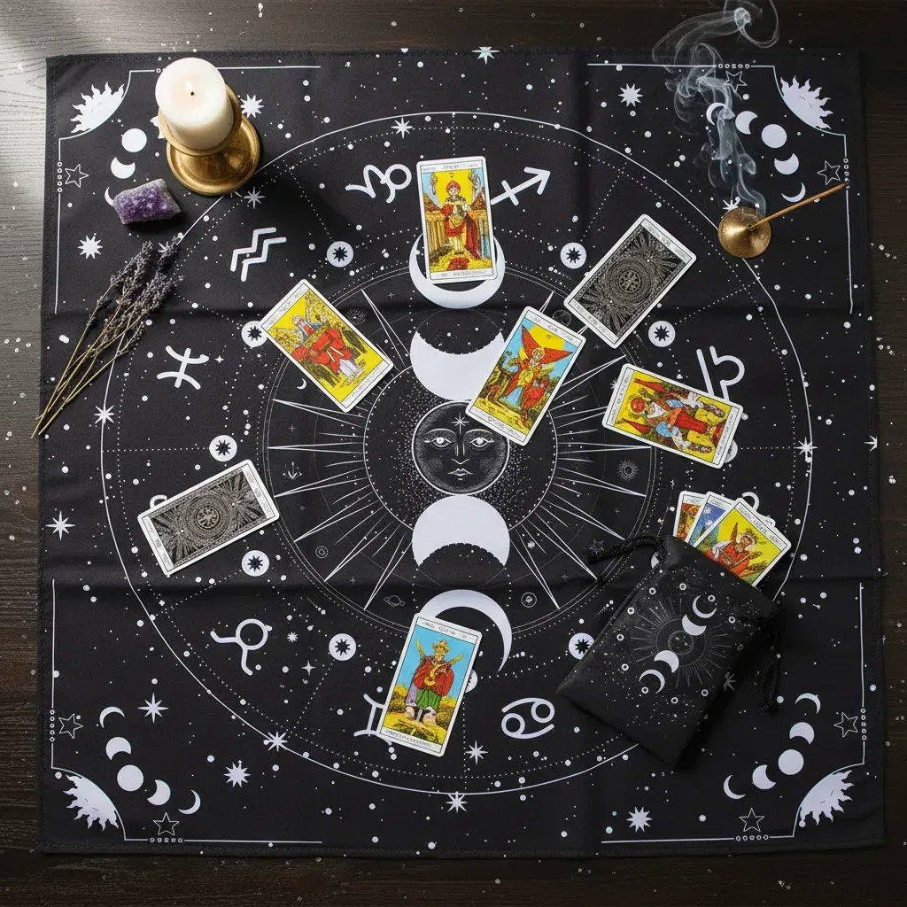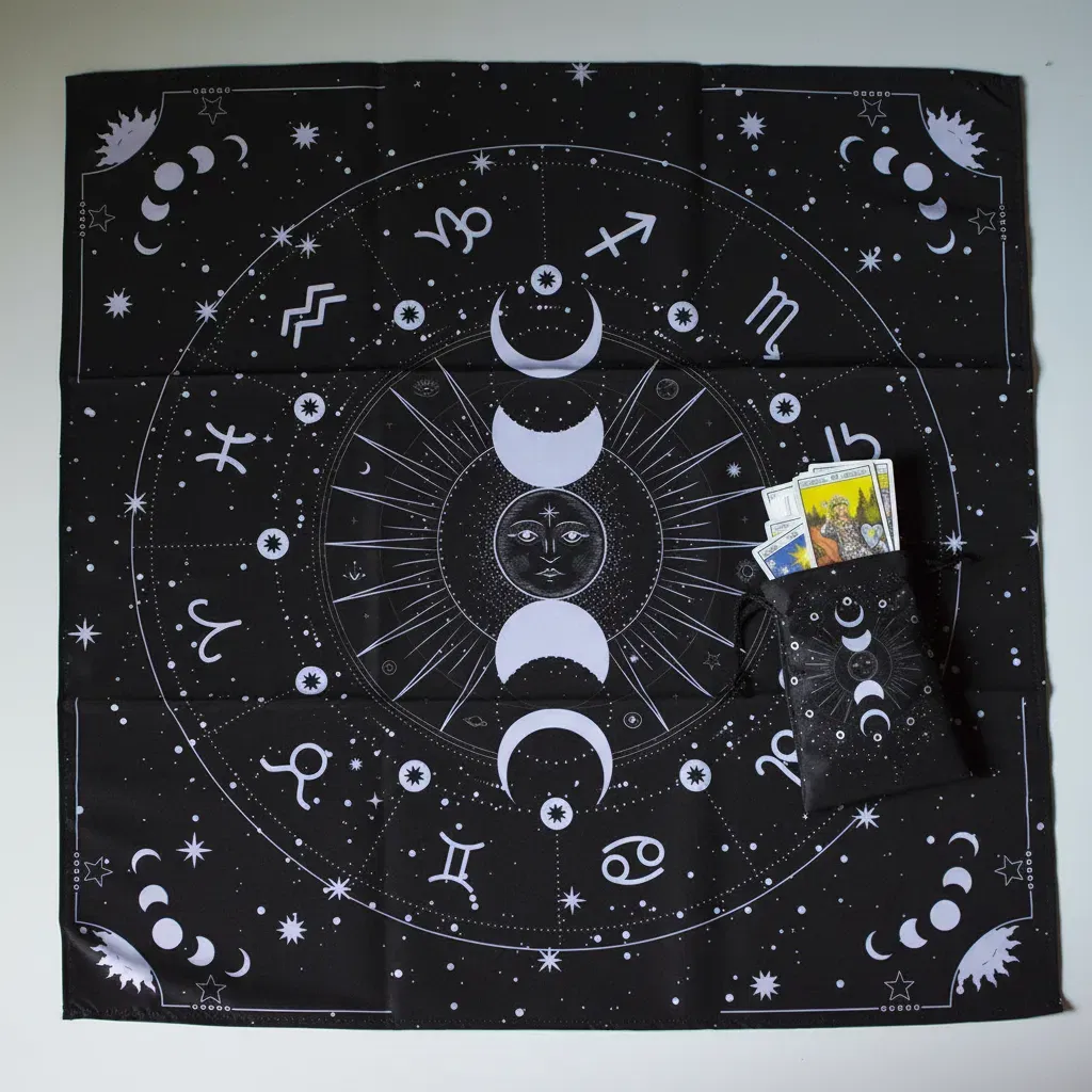 1. Paño de Lectura Profesional: Con una medida de 70cm x 70cm, ideal para realizar desde tiradas rápidas de tres cartas hasta despliegues complejos.
