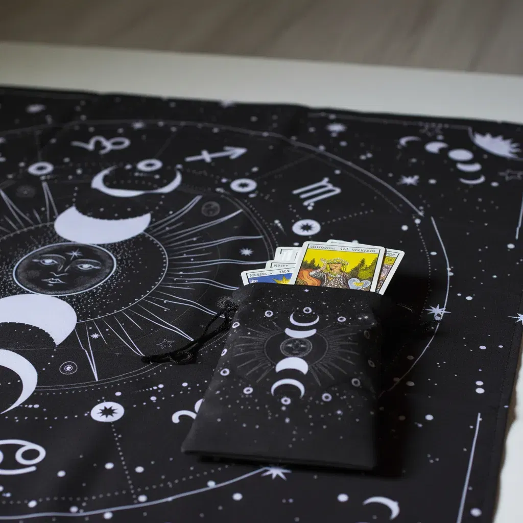 2. Bolsa para Cartas haciendo juego: Incluye una funda de 18cm x 10cm aprox. con el mismo estampado, perfecta para proteger tu mazo (Rider Waite, Marsella, Oráculos) y mantener su energía resguardada.