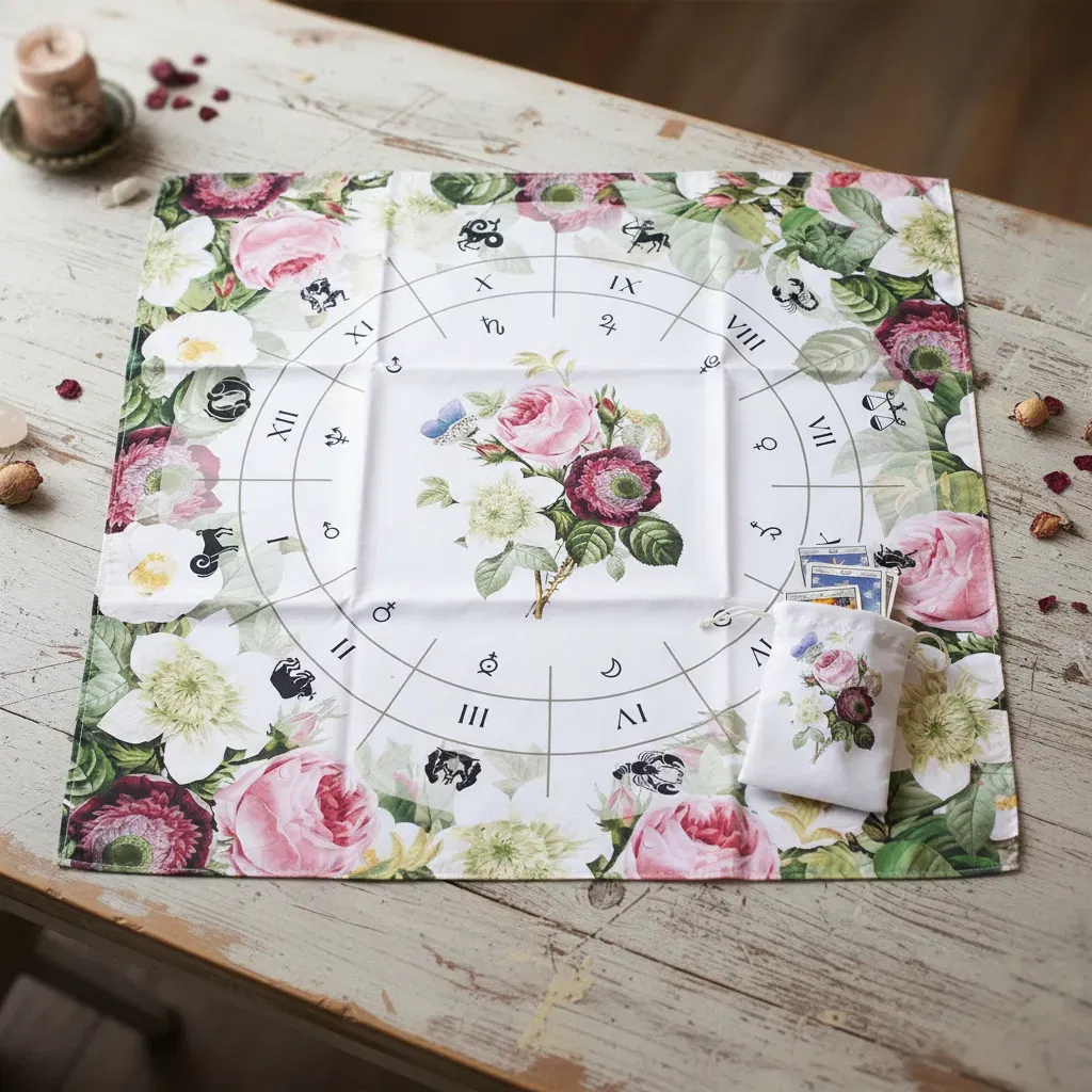 "Elegancia clásica y romanticismo místico para tu altar. Este diseño presenta un exuberante marco de rosas y flores silvestres estilo vintage sobre un fondo blanco puro. Su rueda zodiacal minimalista permite una lectura clara y despejada, siendo el favorito de quienes aman la estética botánica antigua."
