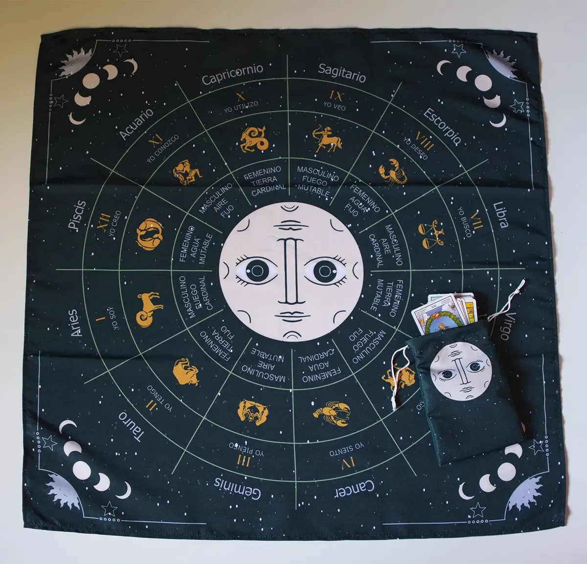 "Profundizá en los misterios del cosmos con nuestro paño Luna Espejo . Este diseño único presenta una cara lunar dual rodeada por una rueda astrológica técnica que incluye signos, planetas, modalidades (Cardinal, Fijo, Mutable) y elementos. Es la herramienta definitiva para el tarotista que busca una guía visual completa y una estética de conocimiento oculto en su espacio sagrado."