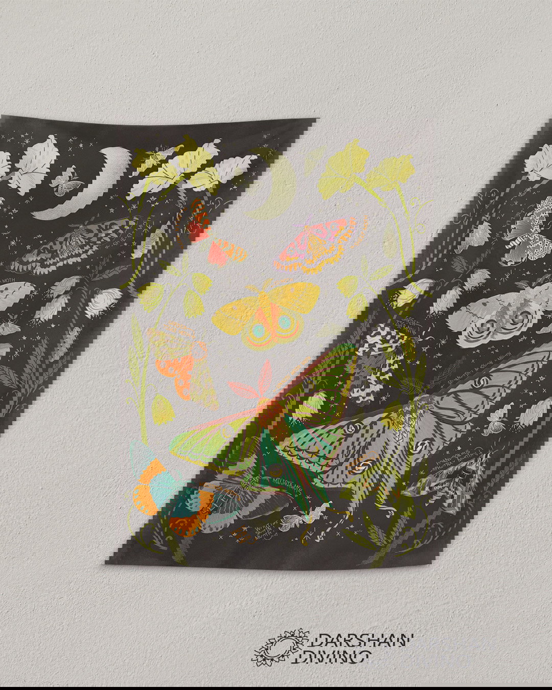 Con una paleta rica en verdes profundos, amarillos vibrantes y corales, este tapiz sobre fondo oscuro crea una atmósfera de estudio místico y conexión con la naturaleza salvaje. Es la pieza ideal para quienes buscan una decoración con profundidad, que invite a la reflexión y celebre los procesos de cambio. Perfecto para tu dormitorio, biblioteca o cualquier rincón que necesite un toque de elegancia esotérica.