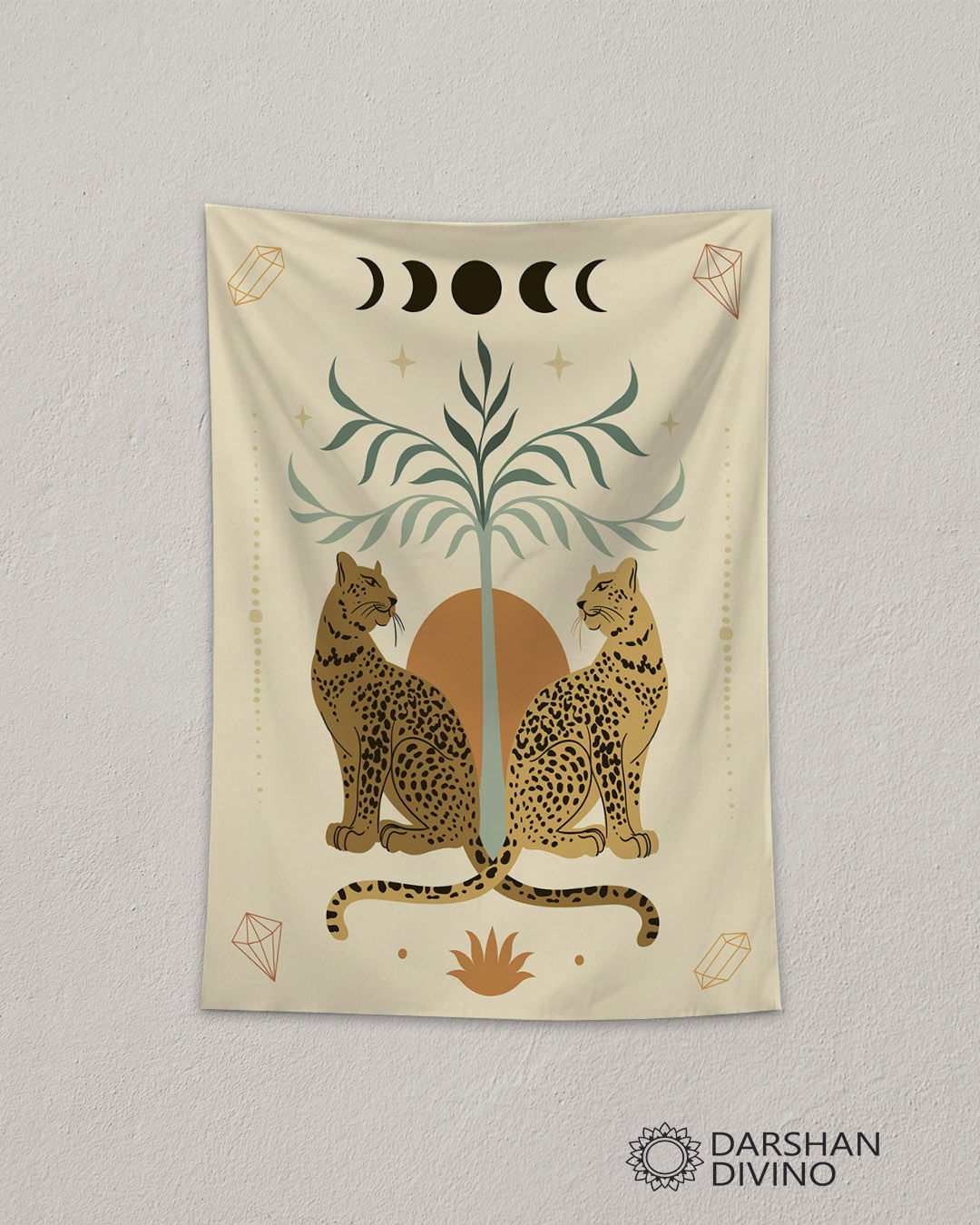 Equilibrio astral y fuerza salvaje. El tapiz "Chitas" es una pieza cargada de simbolismo. Presenta a dos leopardos o chitas enfrentados en perfecta simetría, custodiando un árbol de la vida bajo el ciclo de las fases lunares.