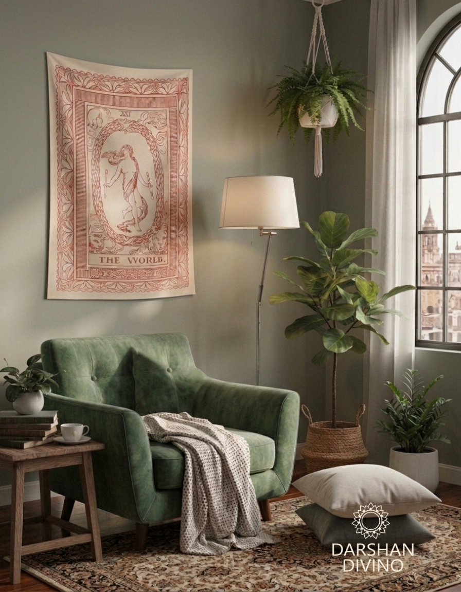 Encuentra tu equilibrio con la energía de "El Mundo" Este tapiz, inspirado en el arcano mayor XXI del tarot, captura la esencia del éxito, la plenitud y la armonía cósmica.