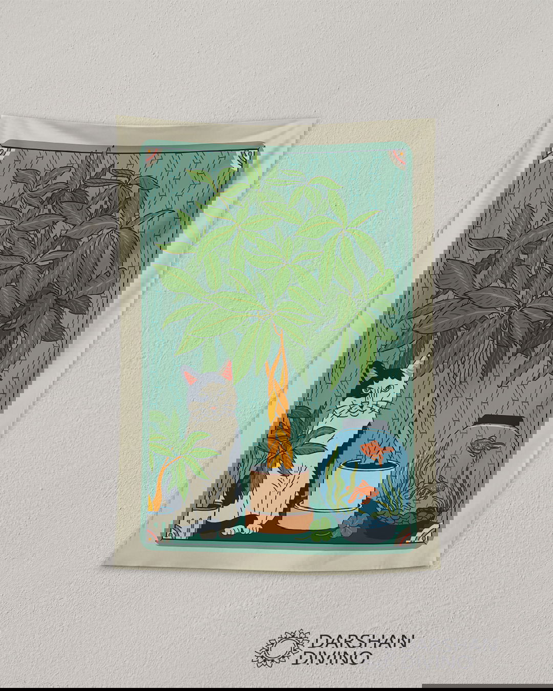 El equilibrio perfecto entre calma y curiosidad. El tapiz "Gatito y Pez Dorado" captura una escena doméstica idílica con un toque de sofisticación artística. En el centro, un gatito bicolor observa serenamente junto a una pecera con peces dorados, todo bajo la sombra protectora de una exuberante planta de la felicidad (Pachira Aquatica).