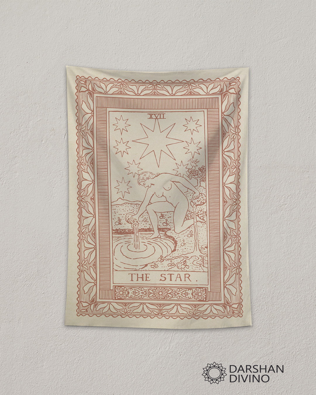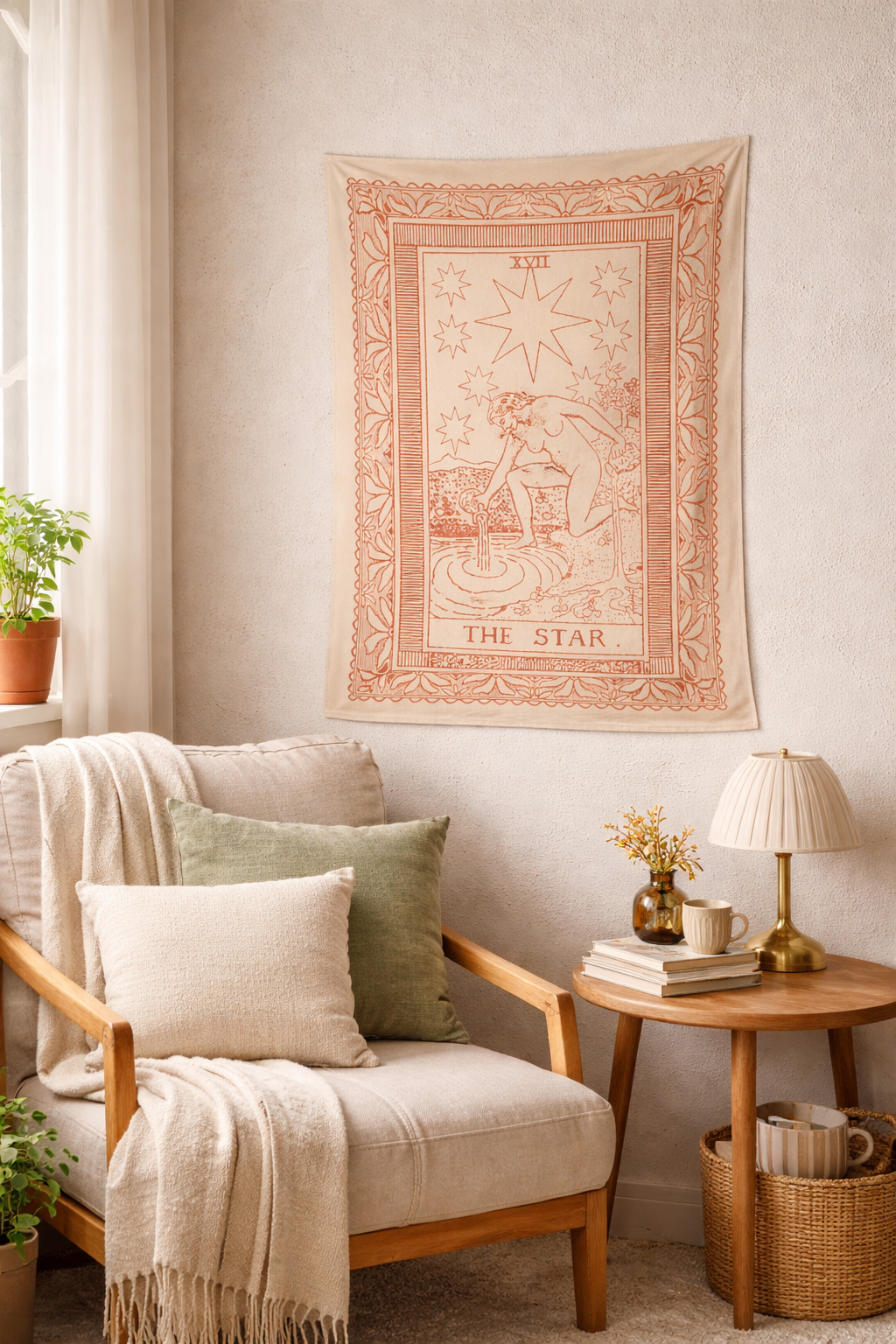 Añadi un faro de esperanza y sanación a tu hogar. Este tapiz de La Estrella, el arcano mayor XVII, es el recordatorio visual perfecto de que siempre hay luz después de la oscuridad. La figura serena vertiendo agua simboliza la renovación, la inspiración y la conexión con el universo. Con su elegante diseño de grabado vintage en tono terracota sobre un suave lienzo color crema, este tapiz es ideal para crear una atmósfera de paz en tu dormitorio o espacio de meditación. Una pieza esencial para quienes buscan nutrición espiritual y tranquilidad en su entorno.