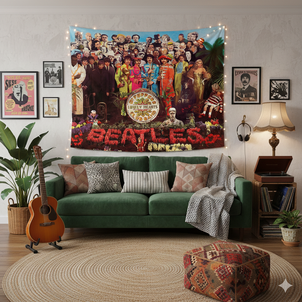 Con sus colores vibrantes y personajes legendarios, es el tapiz ideal para darle vida a un living, un estudio de grabación o cualquier ambiente que necesite un toque de energía retro. Si sos fan de los Fab Four, esta pieza de 1,30m se convertirá en el centro de todas las conversaciones. Fabricado en tela ligera premium, es fácil de colgar y garantiza durabilidad sin perder la intensidad de sus tonos.